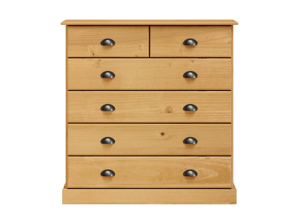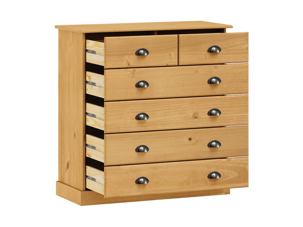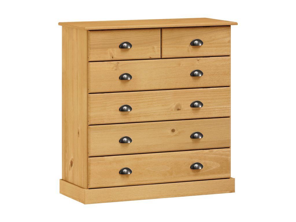 Komoda STANFORD 293261V je vyrobena z masivní borovice s voskovanou úpravou v teplém medovém odstínu.- 4 větší a 2 menší zásuvky