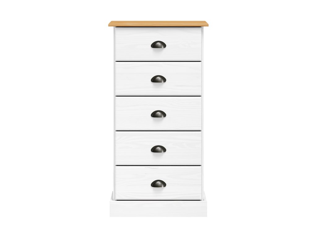 Komoda STANFORD 293971B je vyrobena z masivní borovice a upravena bílým lakem.- 5 zásuvek s kovovými úchytkami a pojezdy