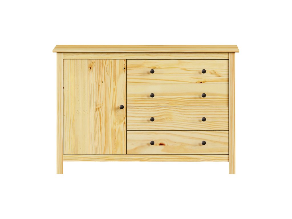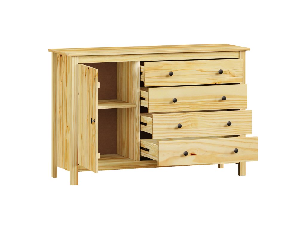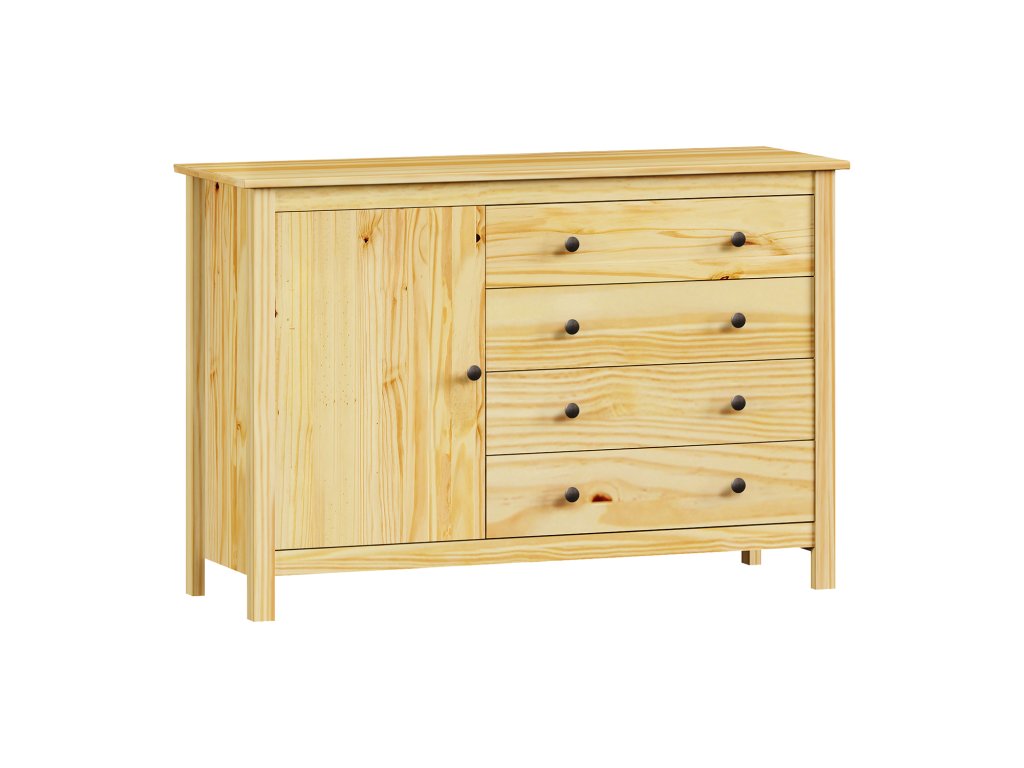 Komoda TORINO 8078K je stylová a praktická část nábytku z lakovaného masivního borovicového dřeva. Nabízí jedna dvířka s policí plus čtyři zásuvky na kovových pojezdech, což poskytuje ideální úložný prostor pro oblečení, dokumenty i domácí doplňky. Elegantní kovové úchytky ladí s moderním interiérem a usnadňují otevírání. Díky masivnímu materiálu a lakované úpravě je nábytek odolný a má dlouhou životnost.- Materiál: masivní borovice