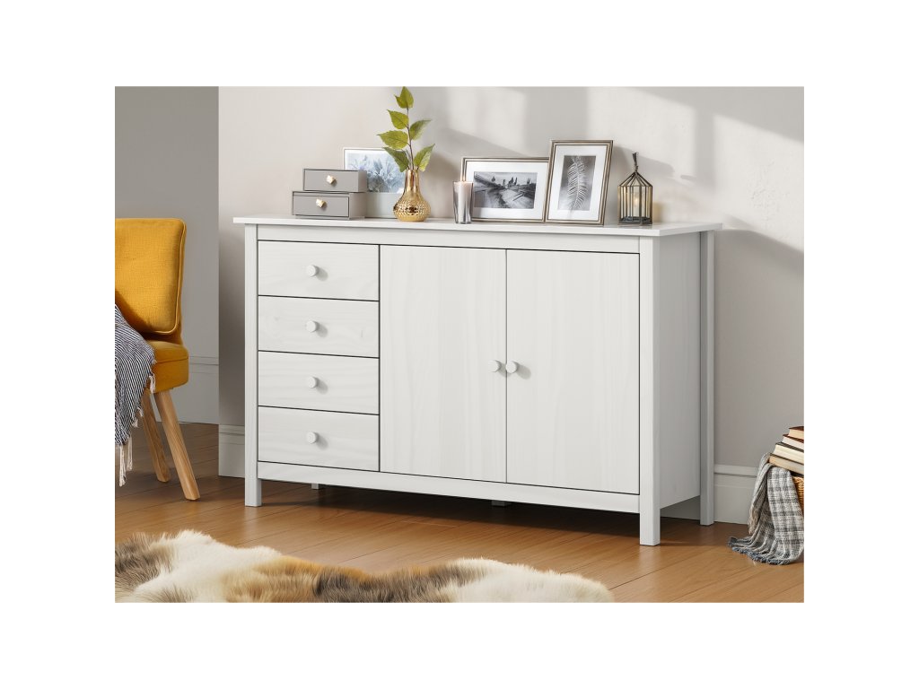 Materiál masiv borovice, barevné provedení bílý lak4 zásuvky s kovovými pojezdy, 2 plné dveře, 1 police