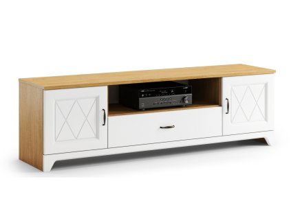 TV stolek BONITO 2 vosk 324105V z masivní borovice – vosk medový odstín, 2 zásuvky s kovovými pojezdy, 1 police, otvor na protažení kabelů.