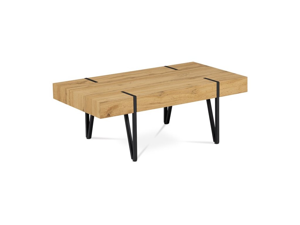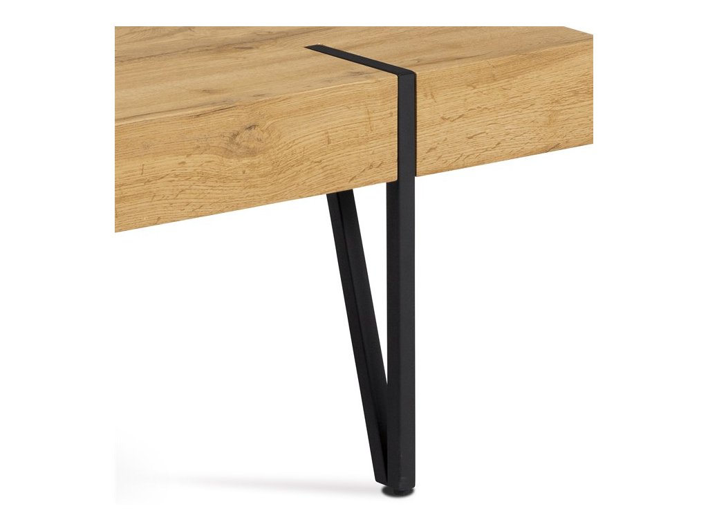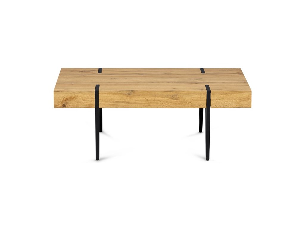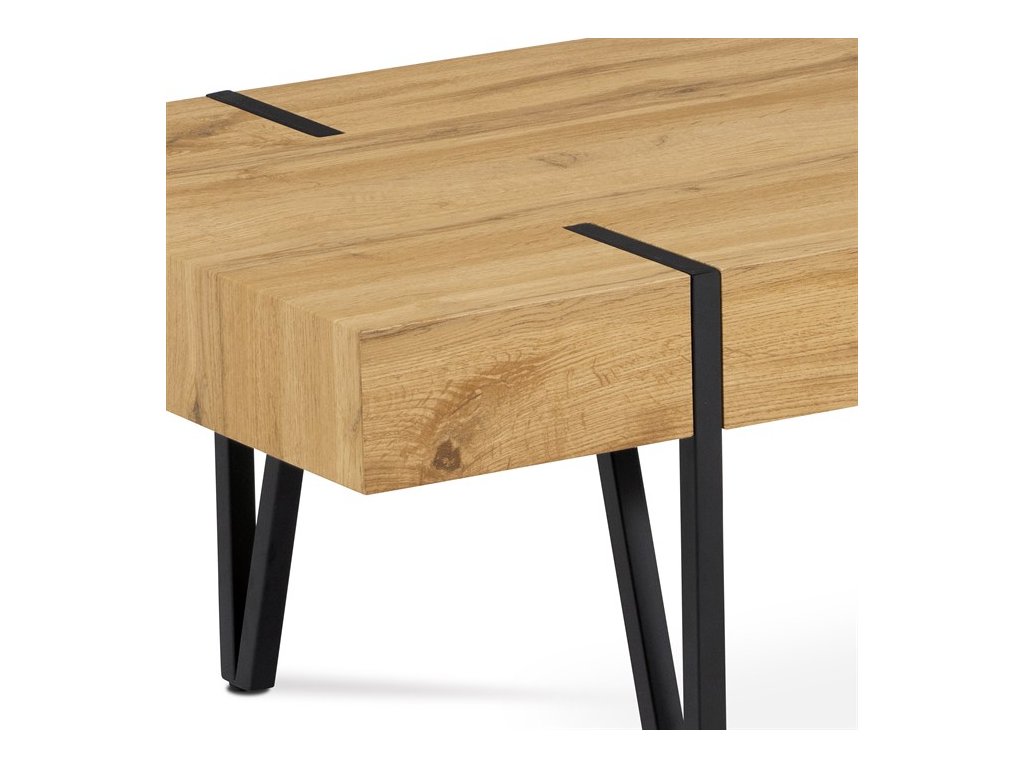 Moderní konferenční stolek z 1,5 cm tlusté MDF desky v dekoru divoký dub a s výškou lubu 10 cm. Podnož je z pevného kovu a je lakovaná matnou černou barvou. Součástí designové podnože jsou černé plastové kluzáky, které snižují riziko poškození Vaší podlahy.Doplňkové parametry