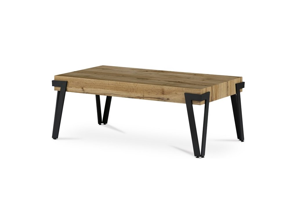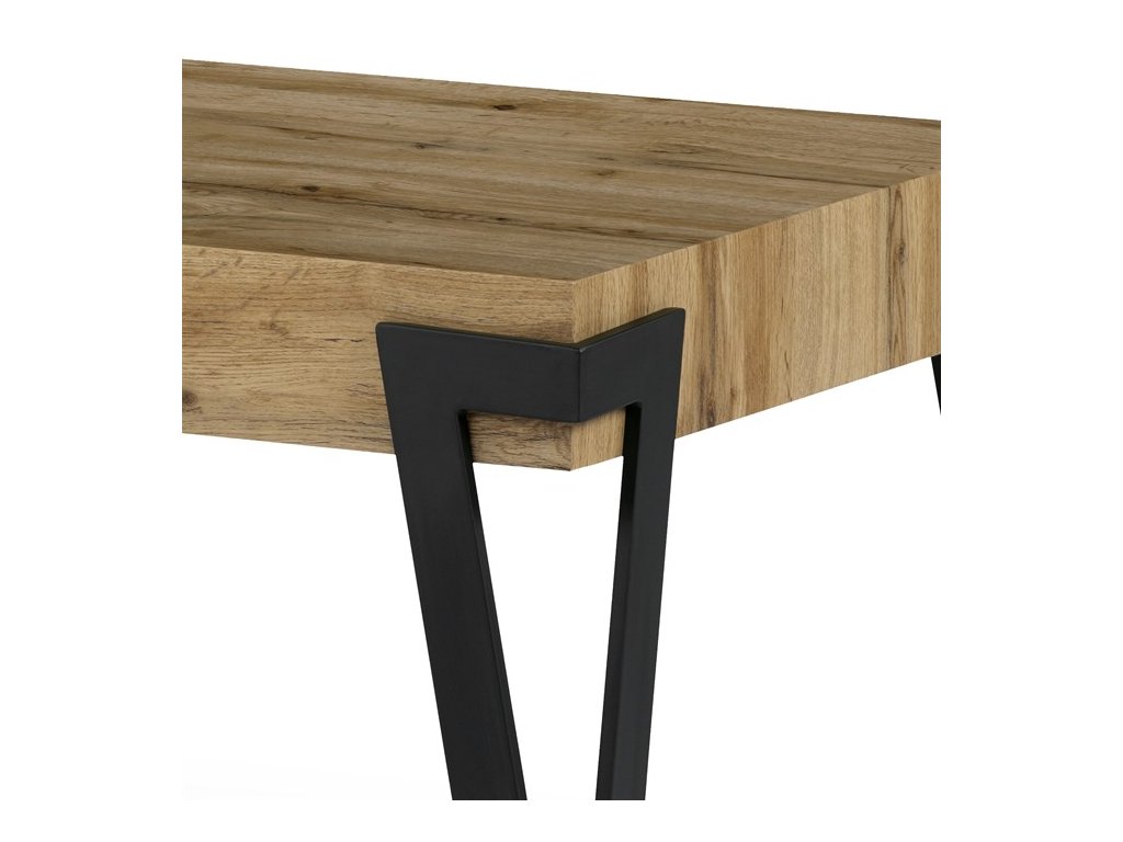 Konferenční stolek přinese do Vašeho domova trochu industriálního šarmu. Obdélníkovou desku z MDF v dekoru divoký dub harmonicky doplňují černé kovové nohy do tvaru V, přecházející až na boky desky. Stolek zaujme i svým nadčasovým designem.Obdélníková deska má rozměr 110 x 60 cm, tloušťku 10 cm. Nohy jsou obdélníkového průřezu a zakončené plastovými kluzáky. Nosnost stolku je cca 20 kg.