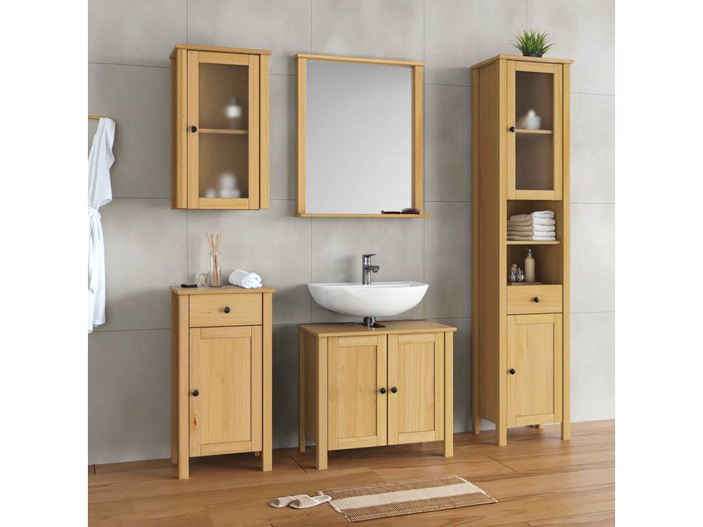 Materiál masiv borovice, barevné provedení buk, sestava vysoké skříňky 372714A, závěsné skříňky 372724A, skříňky 372725A, skříňky pod umývadlo 372729A a zrcadla 372732A, rozměr vysoké skříňky (š/h/v) 42 × 30 × 190 cm, rozměr závěsné skříňky (š/h/v) 42 × 25 × 70 cm, rozměr skříňky (š/h/v) 42 × 30 × 80 cm, rozměr skříňky pod umývadlo (š/h/v) 60 × 35 × 67 cm, rozměr zrcadla (š/h/v) 67 × 12 × 78 cm.Doplňkové parametry