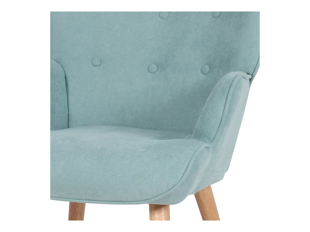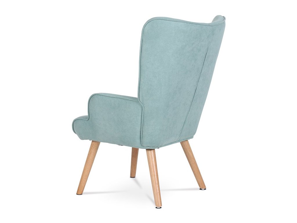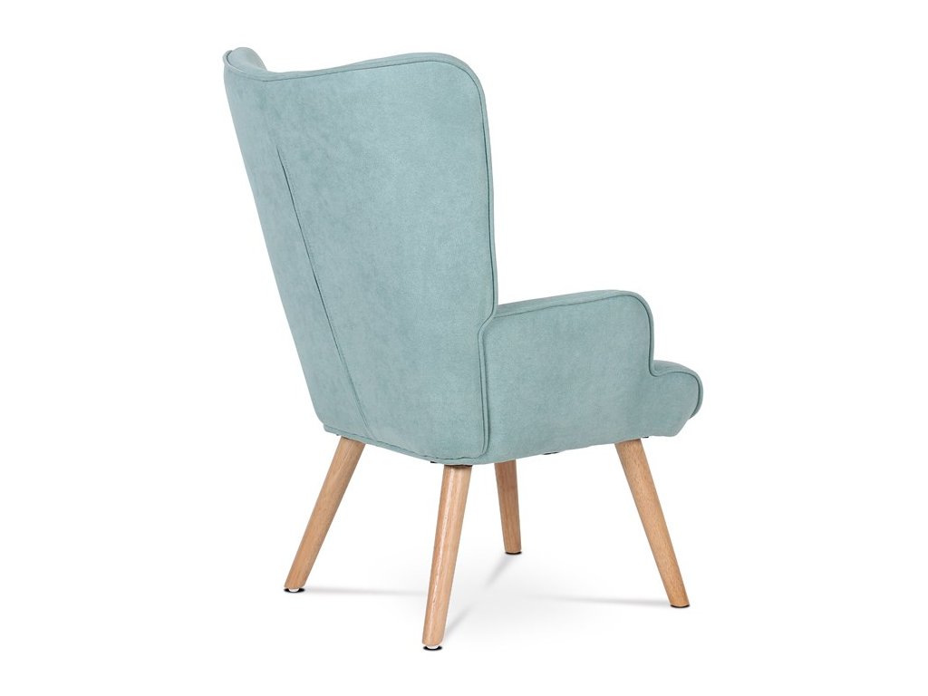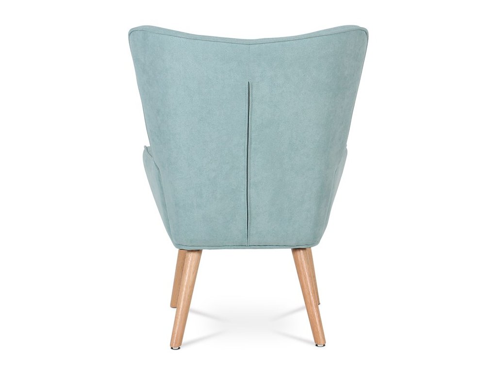Potah je z trendy světle modré látky, kostra z masivního dřeva a výplň z kvalitní PU pěny. V místě sedáku jsou pro zkvalitnění sezení elastické popruhy. Dlouhé kónické dřevěné nohy jsou z masivního kaučukovníku v přírodním odstínu a lakované transparentním lakem. Aby bylo eliminováno poškození podlahové krytiny, jsou opatřeny plastovými kluzáky. U zadních nohou rektifikovatelnými.
