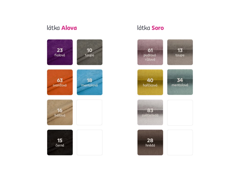 Možnost objednání v 6ti barevných provedeních látky alova v ceně 6.890 Kč nebo látky Soro v ceně 6.990 Kč. Při individuální objednávce je třeba zaplatit 10% zálohu z dané částky. Po uhrazení zálohy bude Vaša objednávka zadána do výroby. Doba dodání 8-10 týdnů.