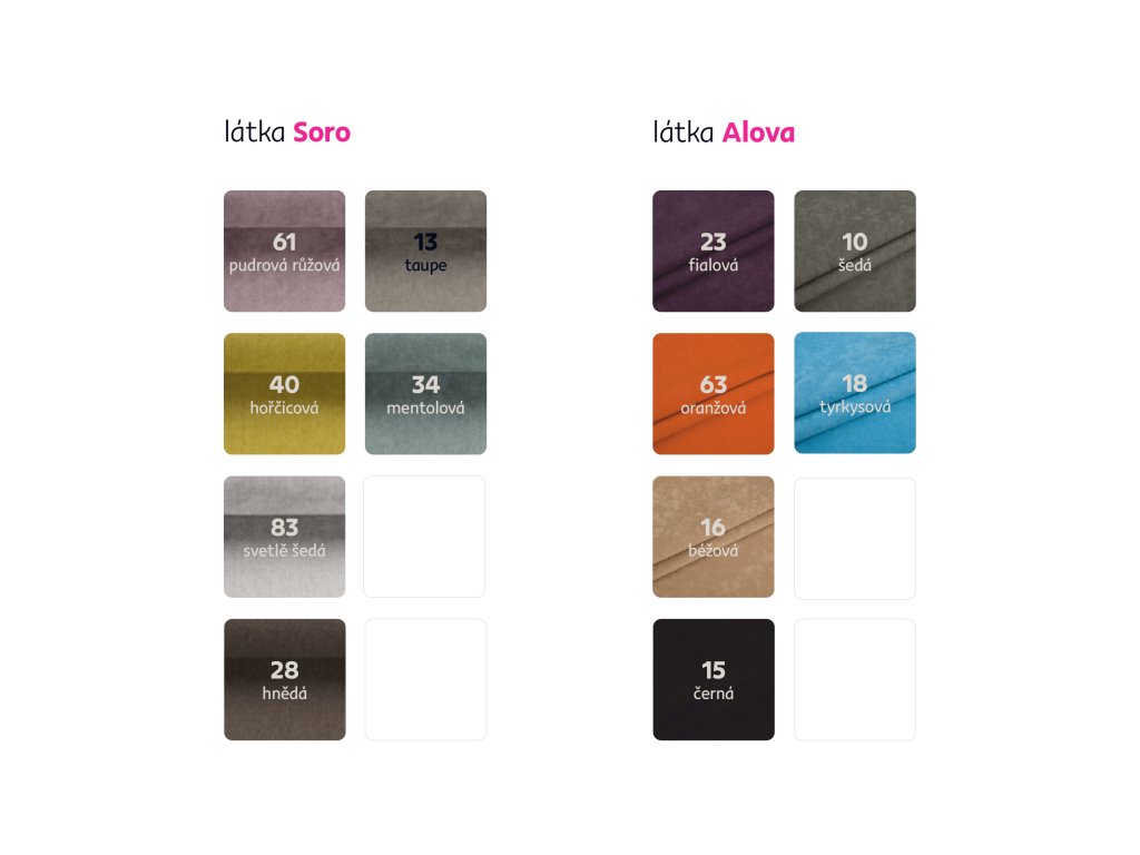 Možnost objednání v 6 barevných provedeních látky alova v ceně 8.390 Kč nebo látky Soro v ceně 8.890 Kč. Při individuální objednávce je třeba zaplatit 10% zálohu z dané částky. Po uhrazení zálohy bude Vaša objednávka zadána do výroby. Doba dodání 8-10 týdnů.