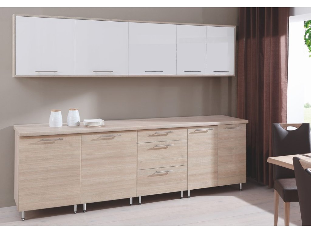 Moderní a levná kuchyně š.260cm.Tato kuchyně je navržena tak, že skříňky se dají poskládat v libovolném pořadí, popřípadě další doobjednat. To vám umožní si sestavit kuchyni podle svých představ. Korpus a spodní dvířka jsou v barvě dub sonoma, vrchní dvířka v barvě bílé v lesku. Vrchní skříňky obsahují okrasnou dřevěnou lištu. Spodní skříňky mají chromové nožky.Sestava se skládá ze spodních skříněk - výška 82, hloubka 44, šířka: