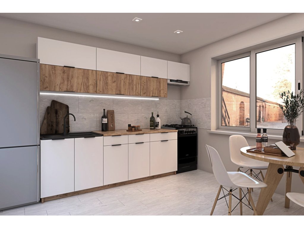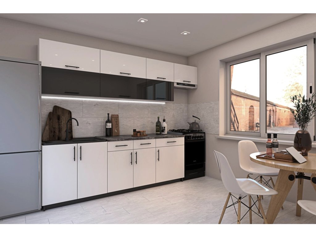 Moderní a levná kuchyně. Tato kuchyně je navržena tak, že skříňky se dají poskládat v libovolném pořadí. To vám umožní si sestavit kuchyni podle svých představ. Korpus je v bílé barvě, části dvířek jsou v bílé lesk a antracit lesk. Nožky jsou regulovatelné. Sokl, pracovní deska, spotřebiče, dřez a digestoř v ceně nejsou.