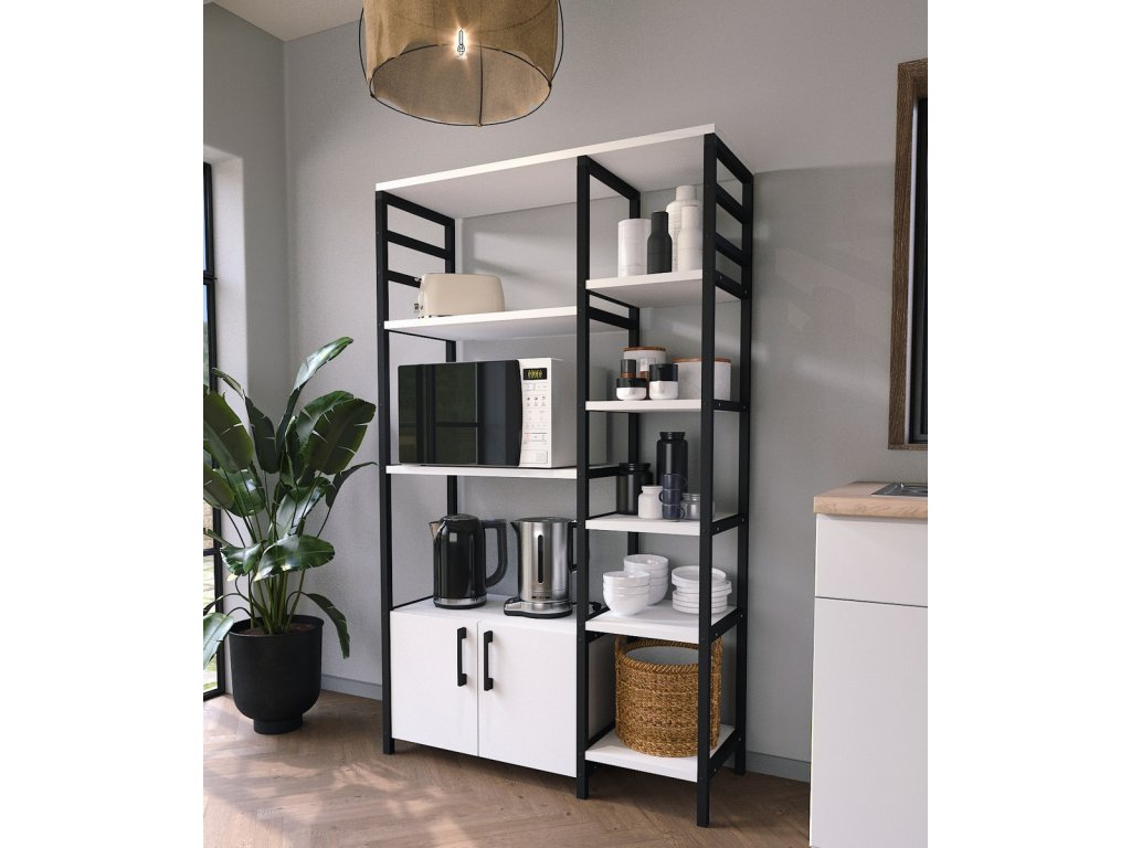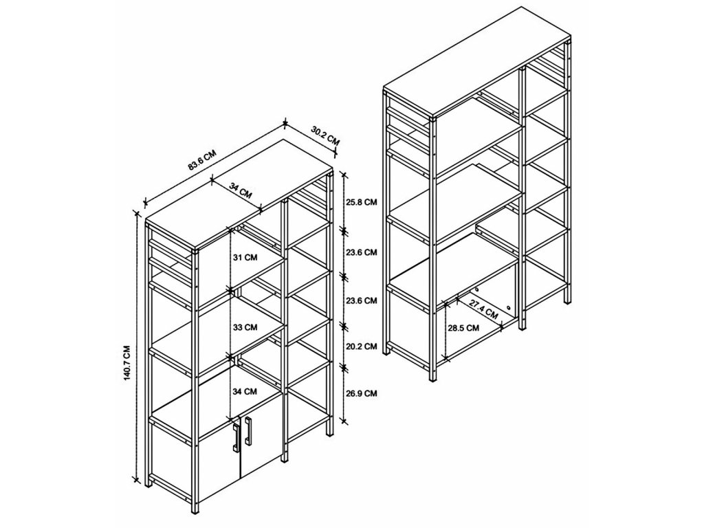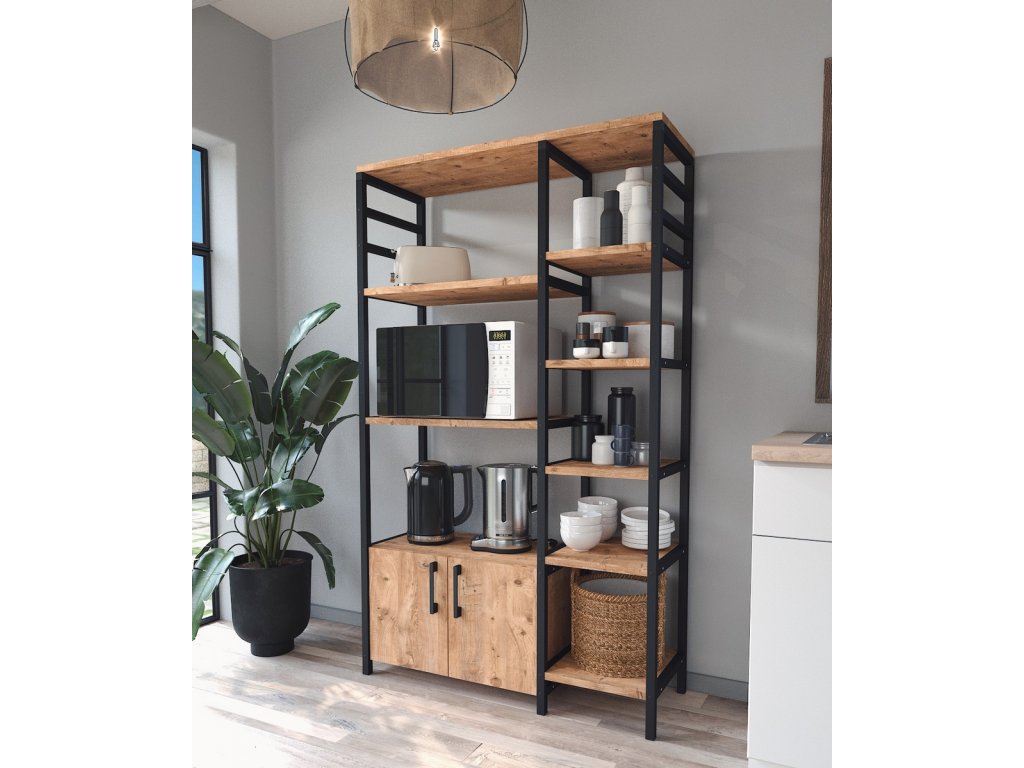 Praktický policový regál industriálního stylu je z kovového rámu v matné černé barvě, dvířka a osm polic je vyrobeno z kvalitní LTD desky v barvě borovice. Dodáváme v demontovaném stavu.Doplňkové parametry
