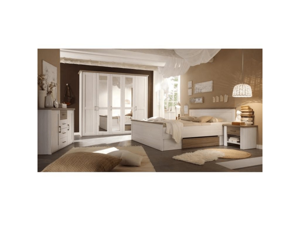 Elegantní ložnicový komplet LUMERA v dekoru pinie bílá a dub sonoma truflový spojuje styl, kvalitu a funkčnost. Ideální volba pro moderní domov.✔ Skříň 241×62×212 cm – 5 dveří, zrcadlo, věšáková i policová část