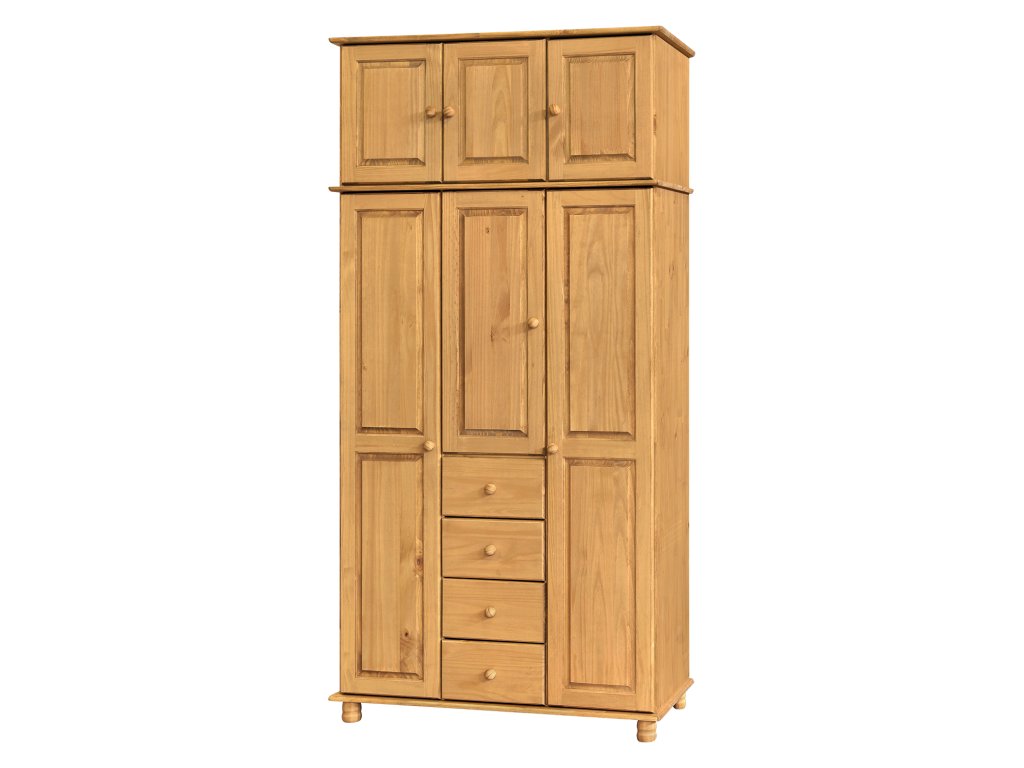 Materiál masiv borovice voskovaná v medovém odstínu, levá část 2 šatní tyče.Pravá část 3 police uprostřed 1 police, 4 zásuvky s kovovými pojezdy.