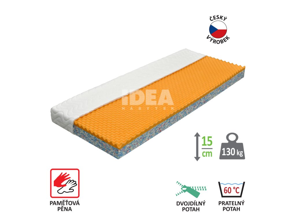 Paměťová pěna střední tuhosti (vrstva 4 cm), jádro z odolné RE pěny, dobré ortopedické vlastností a dlouhá životnost, matrace vhodná pro všechny typy roštů, potah prodyšný, vyrobený ze dvou částí, snímatelný a pratelný do 60 °C, doporučená nosnost do 130 kg.Doplňkové parametry
