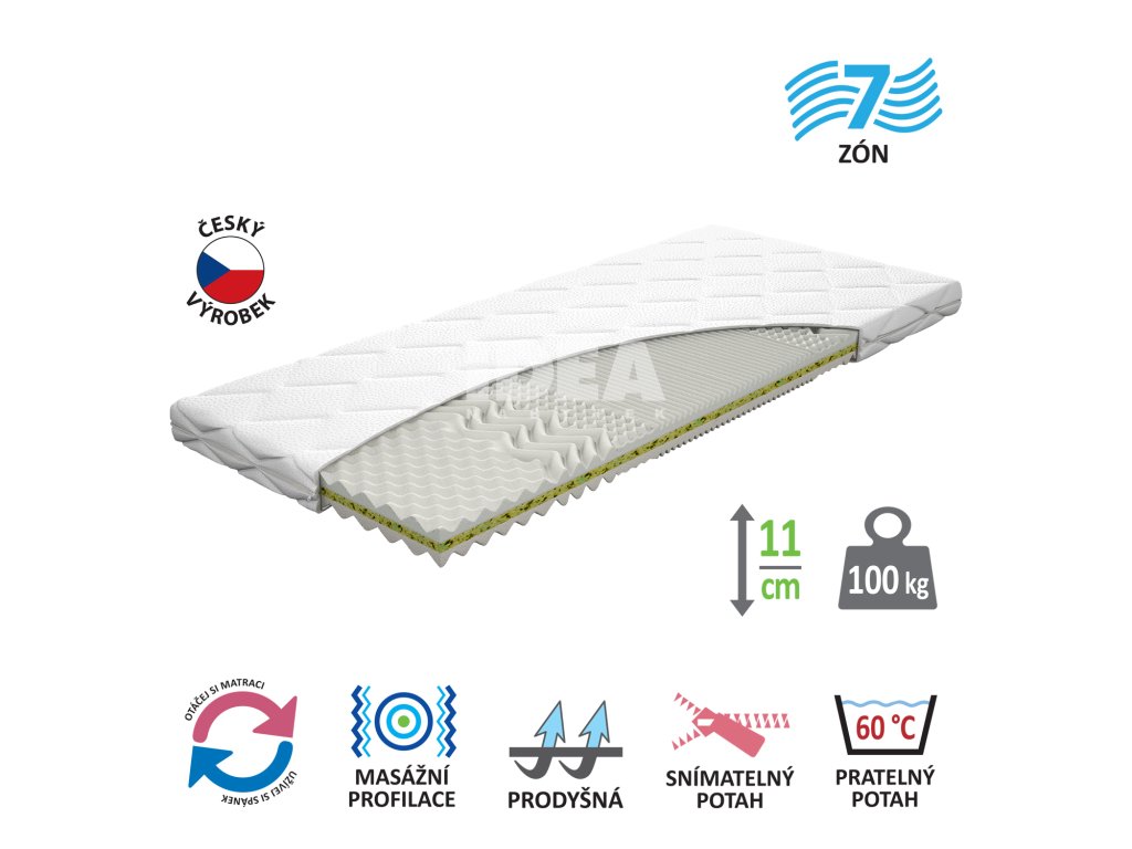 oboustranná sendvičová matrace s ložnými plochami z kvalitních polyuretanových pěn, obě strany – 7zónová anatomická profilace, která umožňuje provzdušnění lůžka a napomáhá uvolnění svalstva, střední část je tvořena z pojeného polyuretanu, střední tuhost matrace (3 z 5), doporučené uložení na pevný i polohovací lamelový rošt, potah snímatelný a pratelný do 60 °C doporučená nosnost do 100 kg, výška matrace 11 cm, výška jádra 10 cmDoplňkové parametry