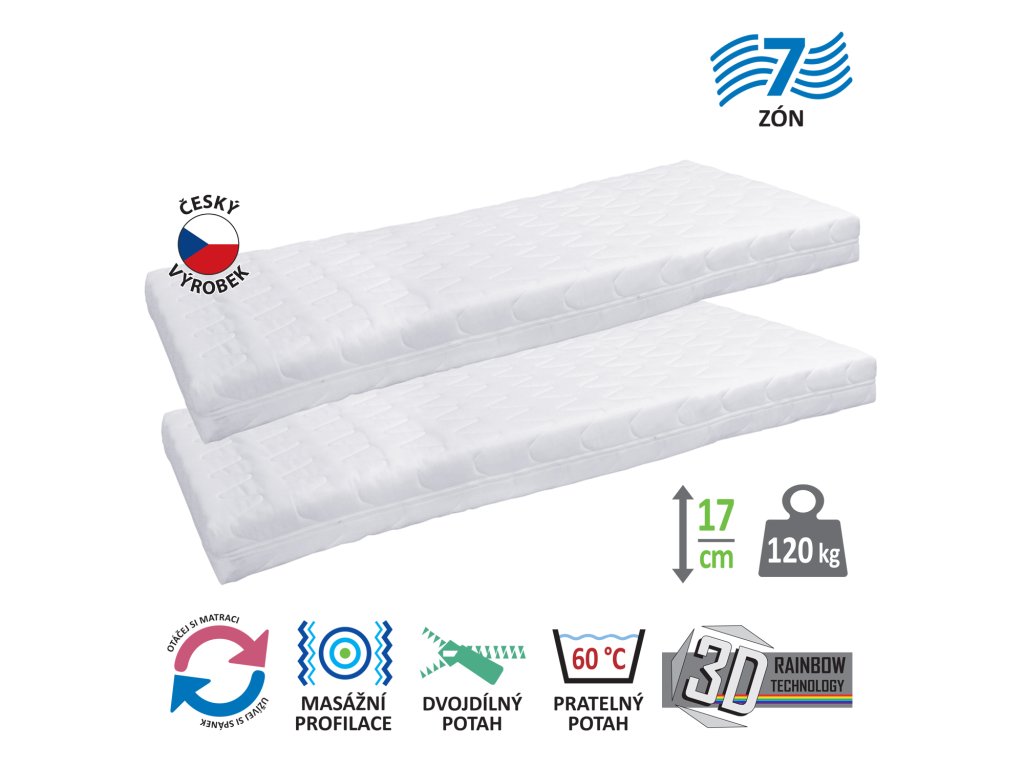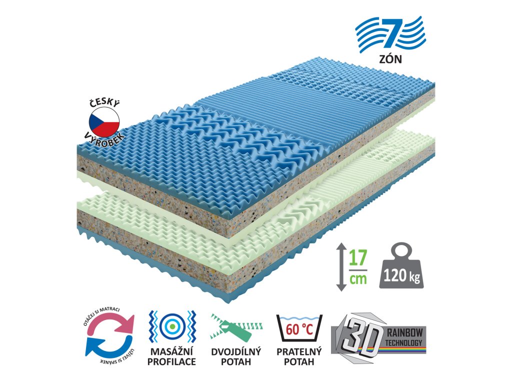 Dvě matrace za cenu jedné 3D Rainbow technologie – speciální profilace na sendvičové vrstvě z kombinace Flexifoam pěn různých vlastností a tuhostí, která zajišťuje komfort, vzdušnost, ortopedické vlastnosti a dlouhou životnost anatomická zónová masážní profilace – 7 zón na obou stranách, jemná masáž v průběhu spánku rozdílná tuhost stran – zelenkavá měkčí strana tuhost 2 z 5, modrá tužší strana tuhost 2,5 z 5 vzdušný potah prošitý dutým vláknem, vyrobený ze 2 částí, snímatelný a pratelný do 60 °C doporučená nosnost do 120 kg, výška matrace 17 cm.Doplňkové parametry