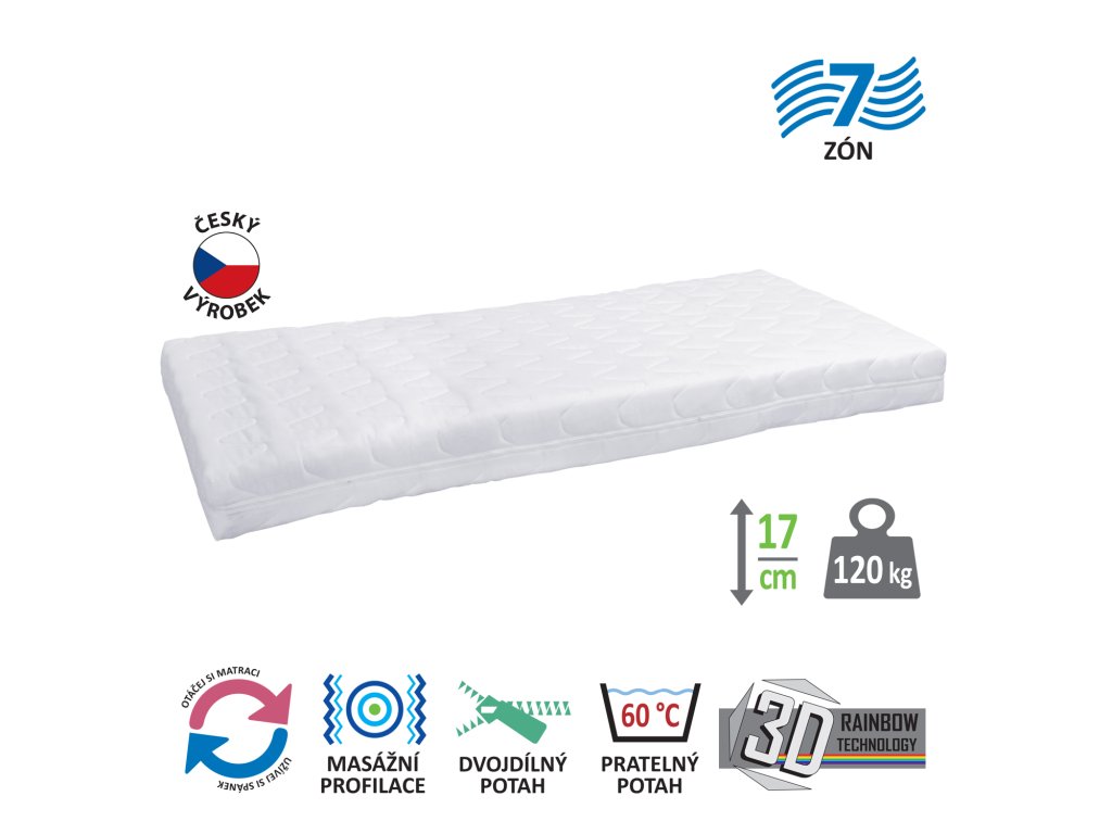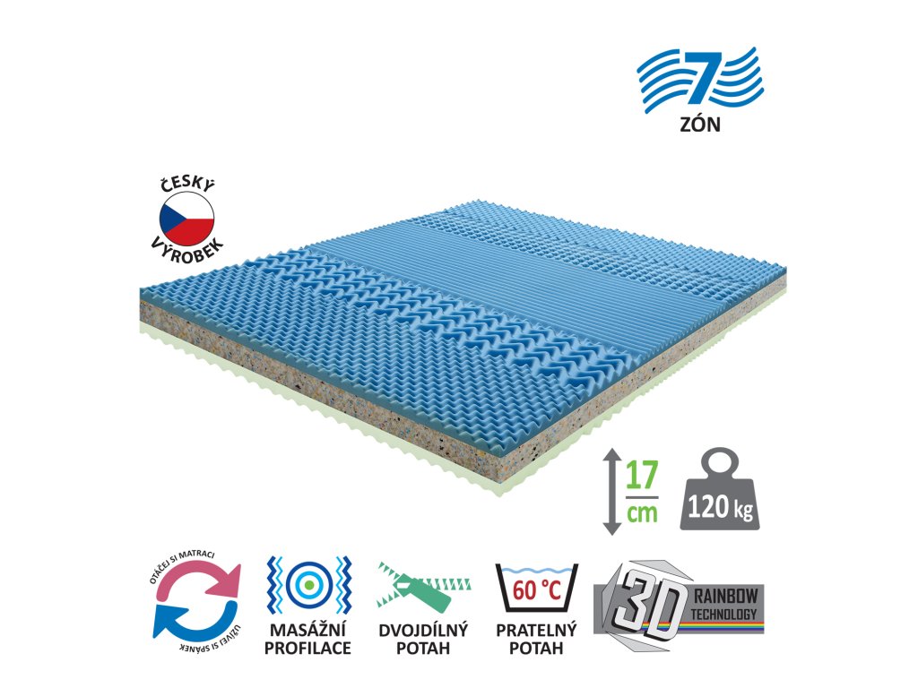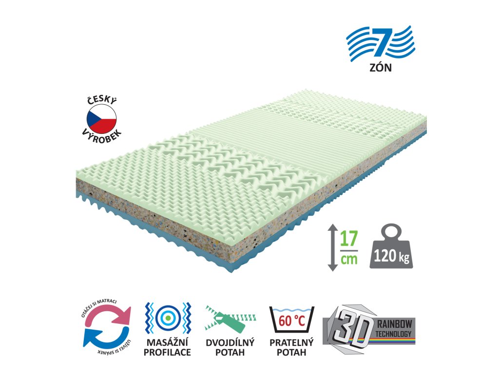 3D Rainbow technologie – speciální profilace na sendvičové vrstvě z kombinace Flexifoam pěn různých vlastností a tuhostí, která zajišťuje komfort, vzdušnost, ortopedické vlastnosti a dlouhou životnost anatomická zónová masážní profilace – 7 zón na obou stranách, jemná masáž v průběhu spánku rozdílná tuhost stran – zelenkavá měkčí strana tuhost 2 z 5, modrá tužší strana tuhost 2,5 z 5 vzdušný potah prošitý dutým vláknem, vyrobený ze 2 částí, snímatelný a pratelný do 60 °C doporučená nosnost do 120 kg, výška matrace 17 cmDoplňkové parametry