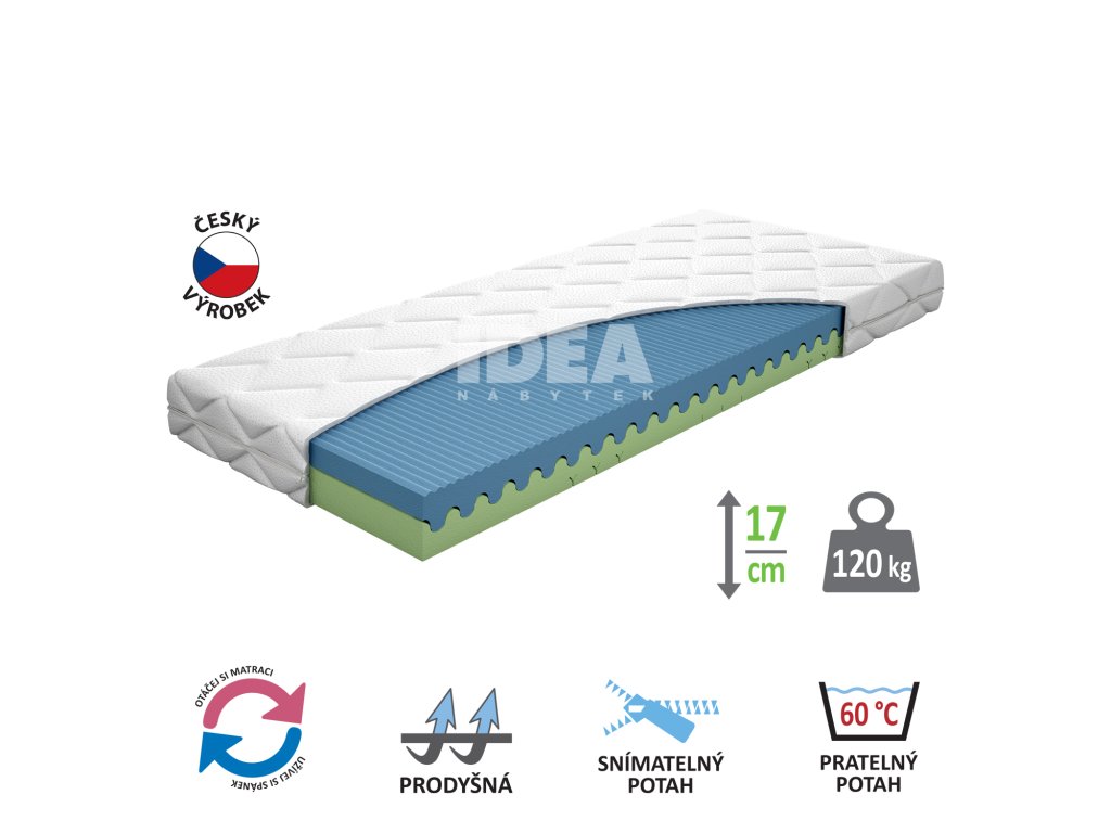 Oboustranná matrace ze dvou druhů kvalitních polyuretanových pěn pěny jsou do sebe spojeny speciálním tvarováním, které garantuje oporu těla během spánku, provzdušnění matrace a velký hygienický komfort rozdílná tuhost stran (2 z 5 / 3 z 5), doporučené uložení na pevný i polohovací lamelový rošt potah snímatelný a pratelný do 60 °C doporučená nosnost do 120 kg, výška matrace 17 cm, výška jádra 16 cm.Doplňkové parametry