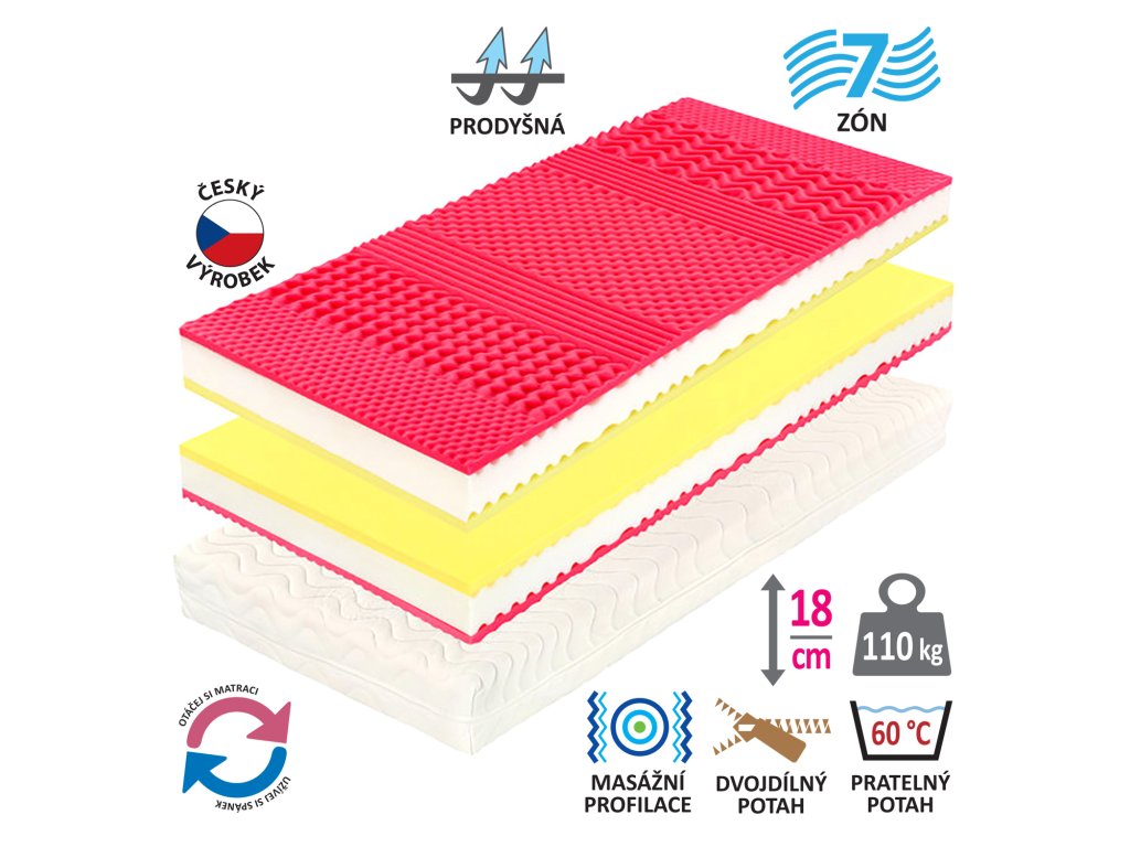 Flexifoam pěna žlutá Classic – vyšší a červená Relax – střední tuhosti, střední část jádra zaručuje díky vlnkám vysokou vzdušnost, rozdělena do 7 anatomických zón různé tuhosti a profilace pěn – ortopedické vlastnosti potah Relaxtic – prošitý vzdušným dutým vláknem, vyrobený ze 2 částí, snímatelný a pratelný do 60 °C,optimalizovaná pro zátěž do 110 kgDoplňkové parametry