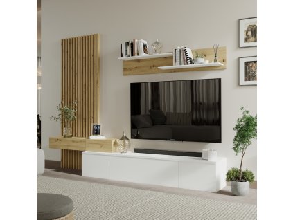 Obývací sestava LAVRIO se stylovým lamelovým panelem.Barevné provedení - bílá mat/dub Artisan.