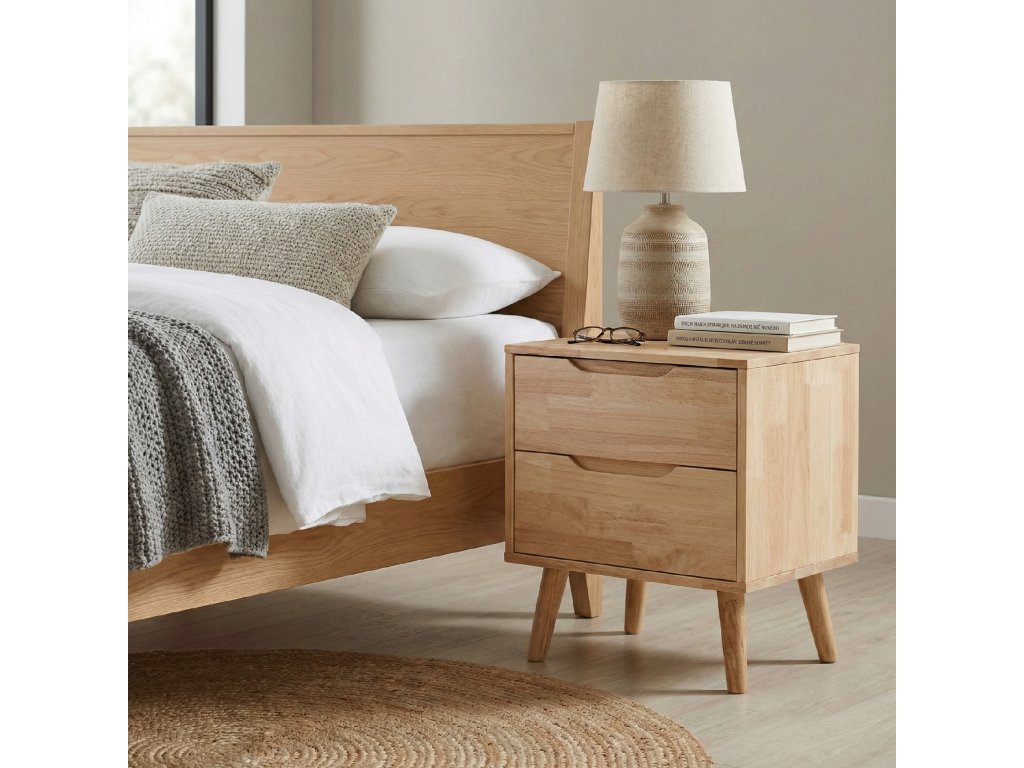 Masivní noční stolek BRUNI z borového a kaučukového dřeva v přírodní barvě nabízí funkční úložný prostor ve 2 zásuvkách.- Rozměry: 43 × 40,5 × 48 cm