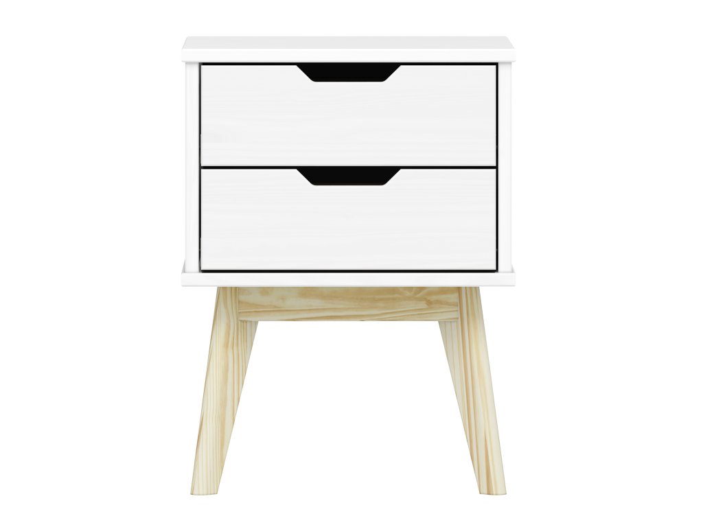 Noční stolek, materiál masiv borovice, barevné provedení bílý lak, 2 zásuvky s kovovými pojezdy.Doplňkové parametry