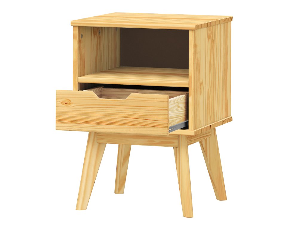 Noční stolek, materiál masiv borovice, lakované provedení, 1 zásuvka s kovovými pojezdy.Doplňkové parametry
