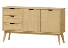 Komoda TORINO 8097K – masiv borovice (lak), 4 zásuvky s kovovými pojezdy, 2 plná dvířka s policí + 1 otevřená police, kovové úchytky. Rozměry 150 × 40 × 80 cm.