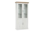 Masivní vitrína z borovice s lakovaným povrchem, 2 částečně prosklená dvířka, 4 police, kovové úchytky.