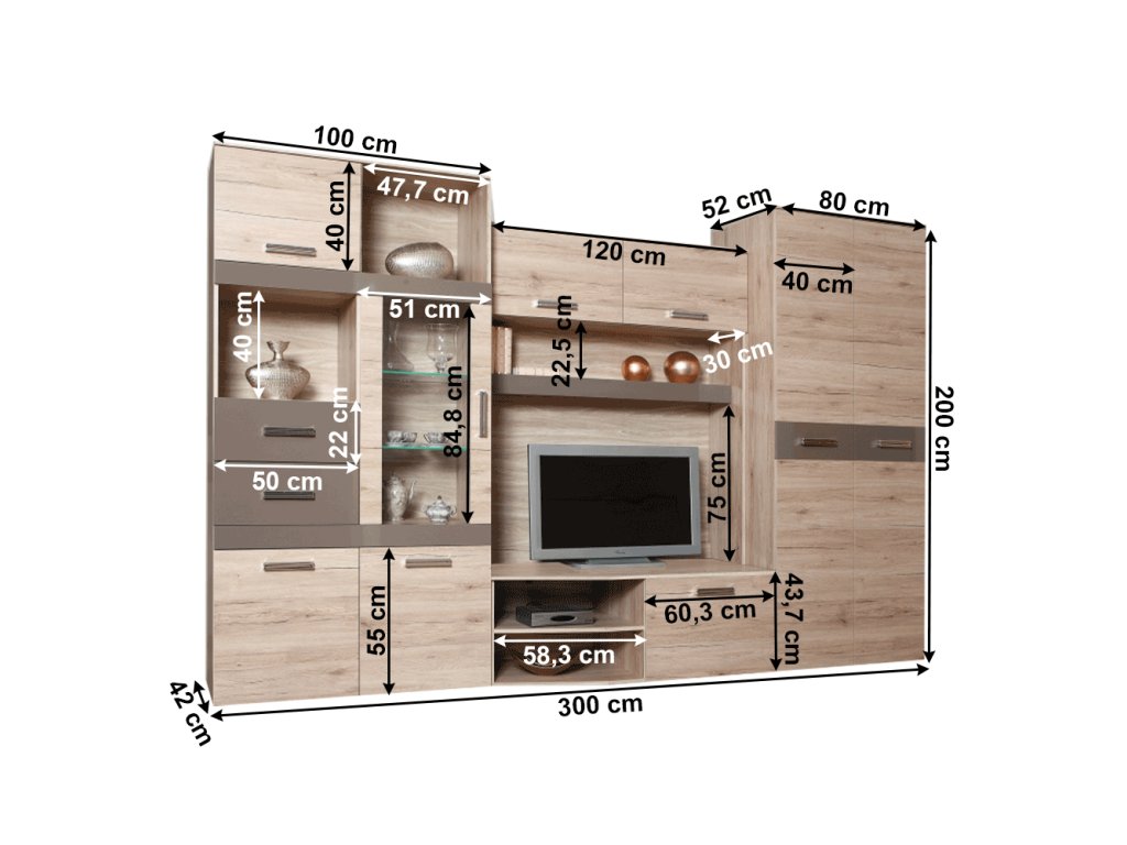 Rozměry obývací stěny (ŠxHxV): 300x42-52x200 cm