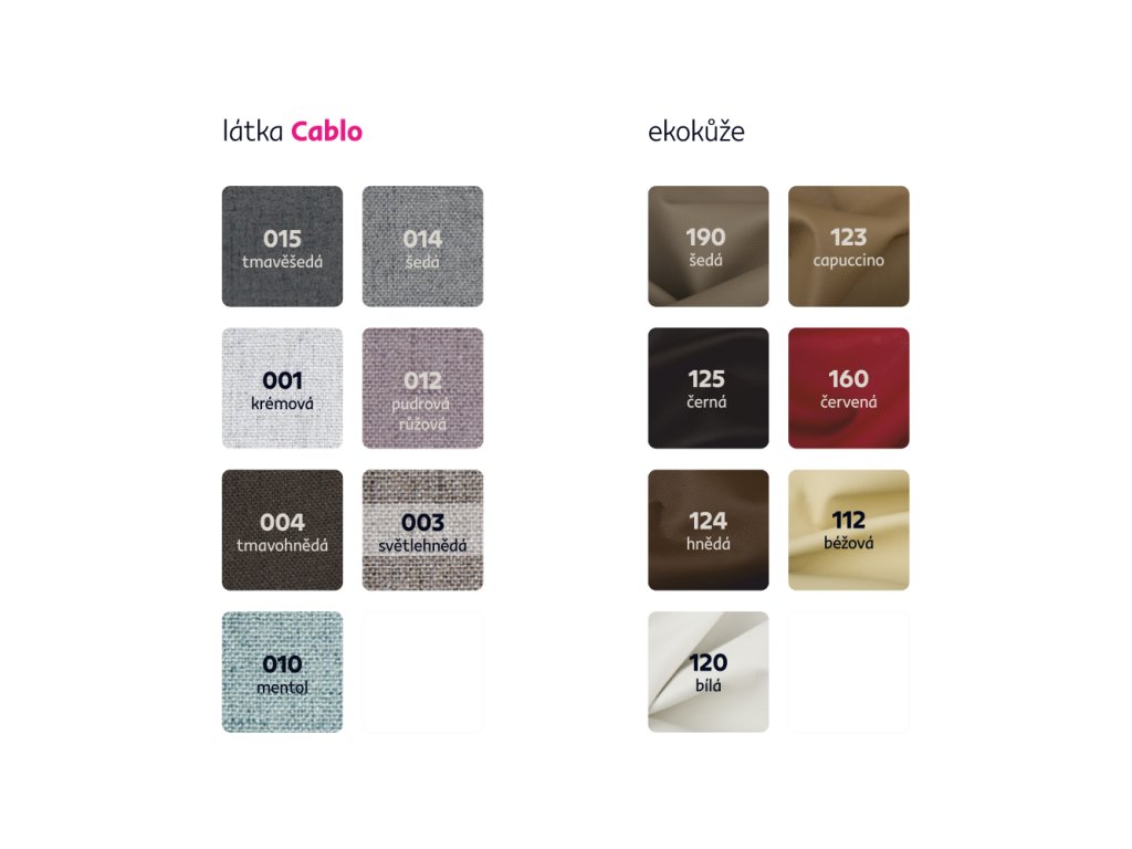 Máme pro vás hned sedm barev látky Cable a sedm barev ekokůže. Při individuální objednávce je třeba zaplatit 10% zálohu z dané částky. Po uhrazení zálohy bude Váš požadavek zadána do výroby. Doba dodání 8-10 týdnů. Cena takto složené sedačky v jiné barvě závisí na počtu jednotlivých dílů, které ji tvoří.