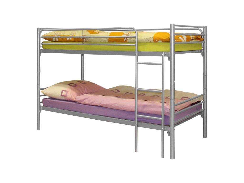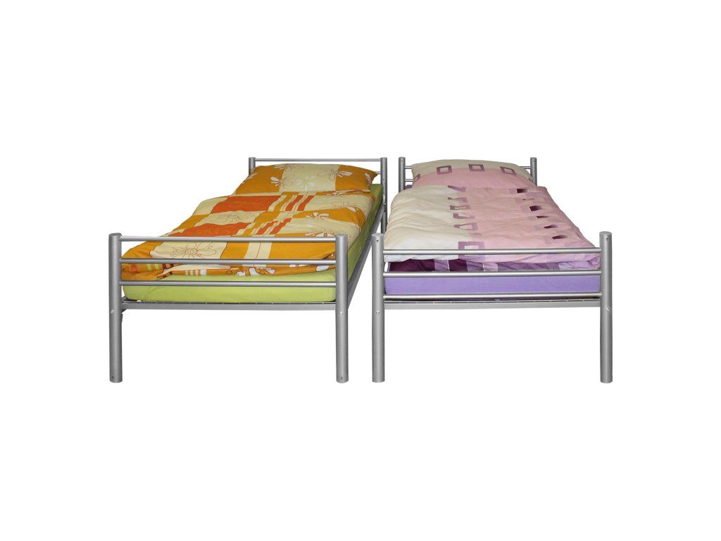 kovová konstrukce, barevné provedení stříbrná, nohy trubky o průměru 50 mm možnost rozložení na dvě stejné postele, nosnost jedné postele 140 kg cena bez matrace, ale včetně kovových roštů doporučený rozměr matrace 90 × 200 cm, maximální výška matrace 11 cmDoplňkové parametry