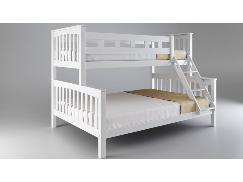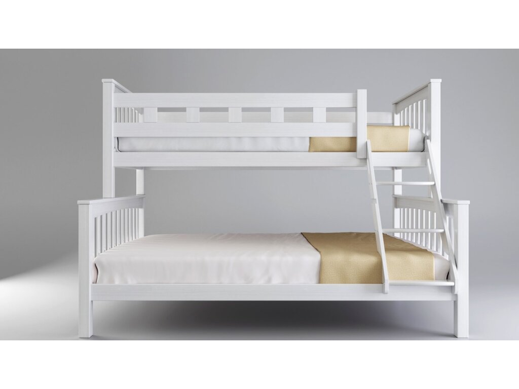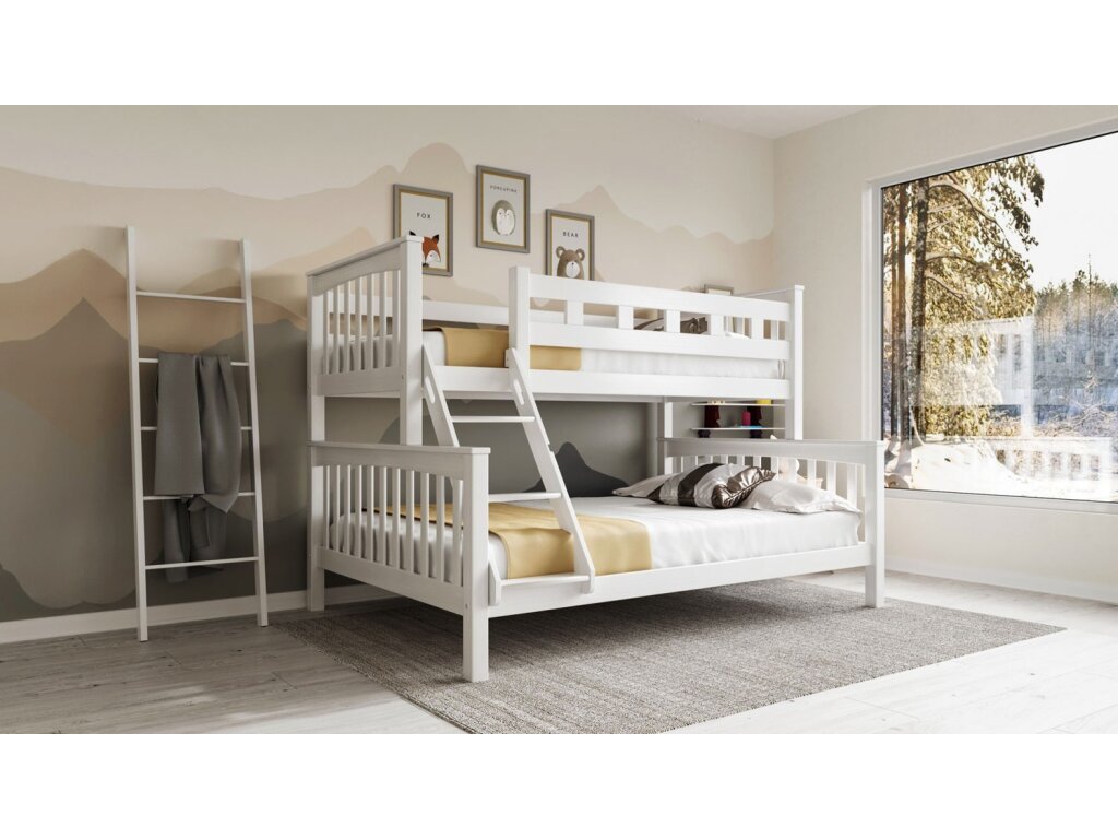 Praktická a stylová patrová postel z masivního bukového dřeva v bílém odstínu. Ideální řešení pro dětský nebo studentský pokoj, kde je potřeba ušetřit prostor a zároveň nabídnout pohodlné spaní až pro tři osoby. Moderní patrová postel, jejíž dolní lůžko je 140 cm široké a horní lůžko má šíři 90 cm. Bezpečnostní zábrany na horním lůžku zajistí bezpečný spánek.