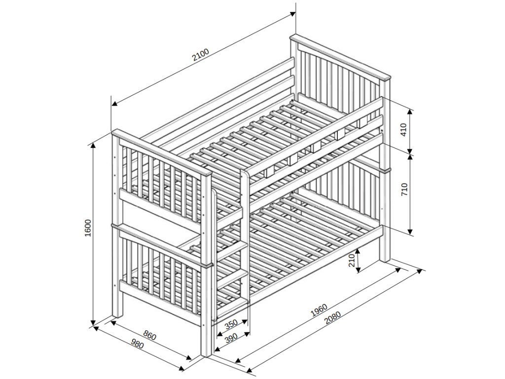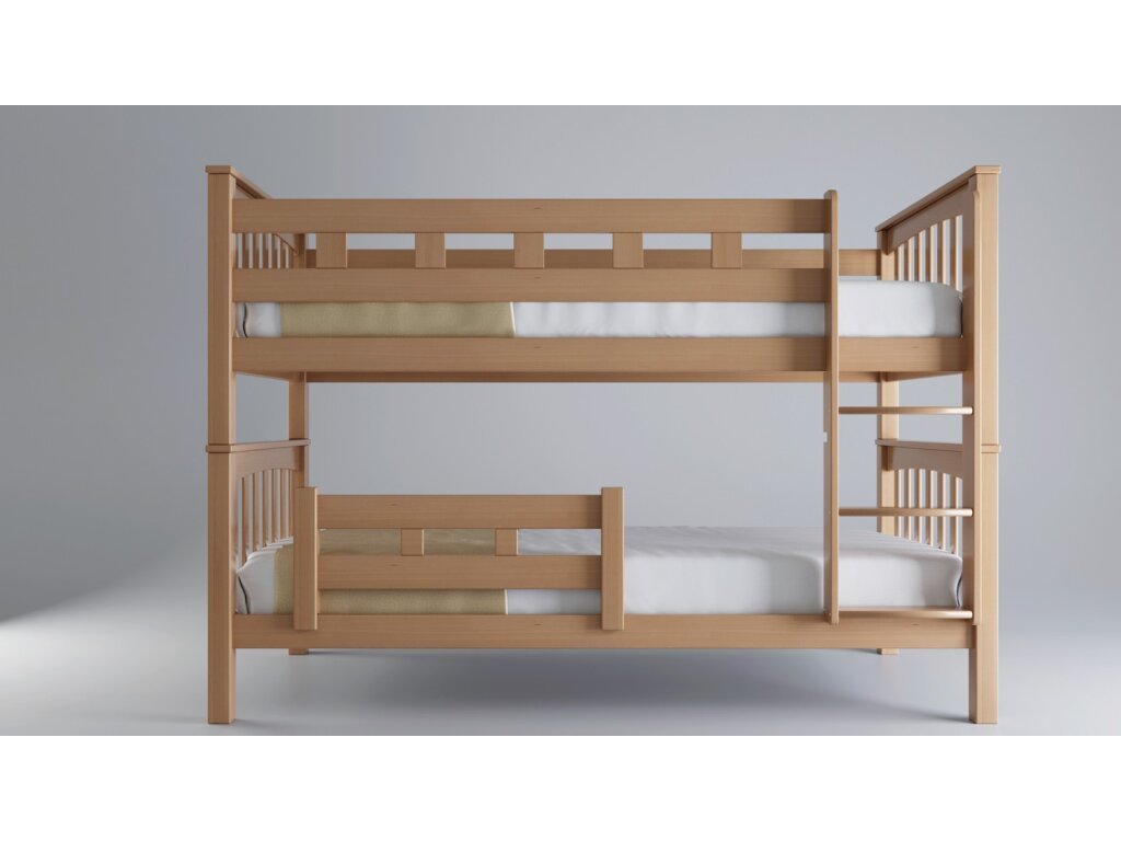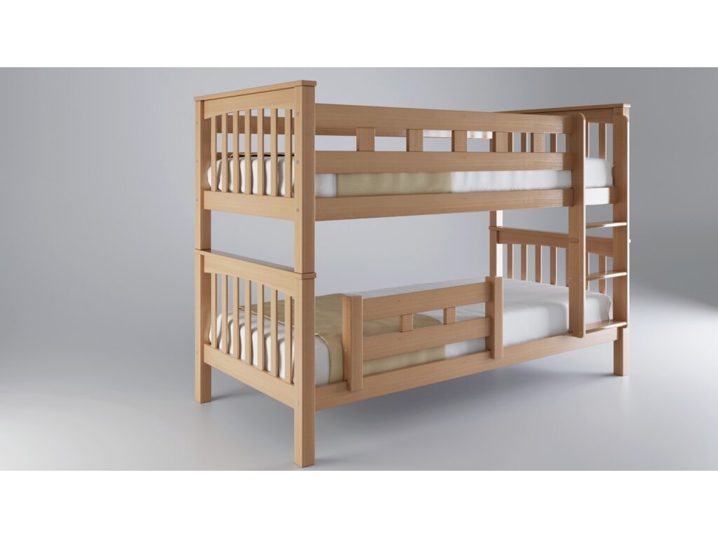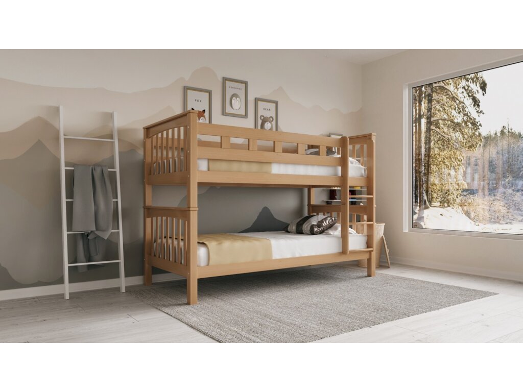 Praktická a stylová patrová postel z masivního bukového dřeva v přírodním odstínu. Ideální řešení pro dětský nebo studentský pokoj, kde je potřeba ušetřit prostor a zároveň nabídnout pohodlné spaní pro 2 osoby. Bezpečnostní zábrany na horním lůžku zajistí bezpečný spánek. Obě lůžka mají šířku 90 cm a rošty jsou součástí postele.