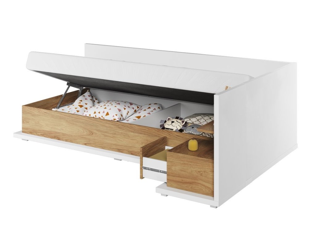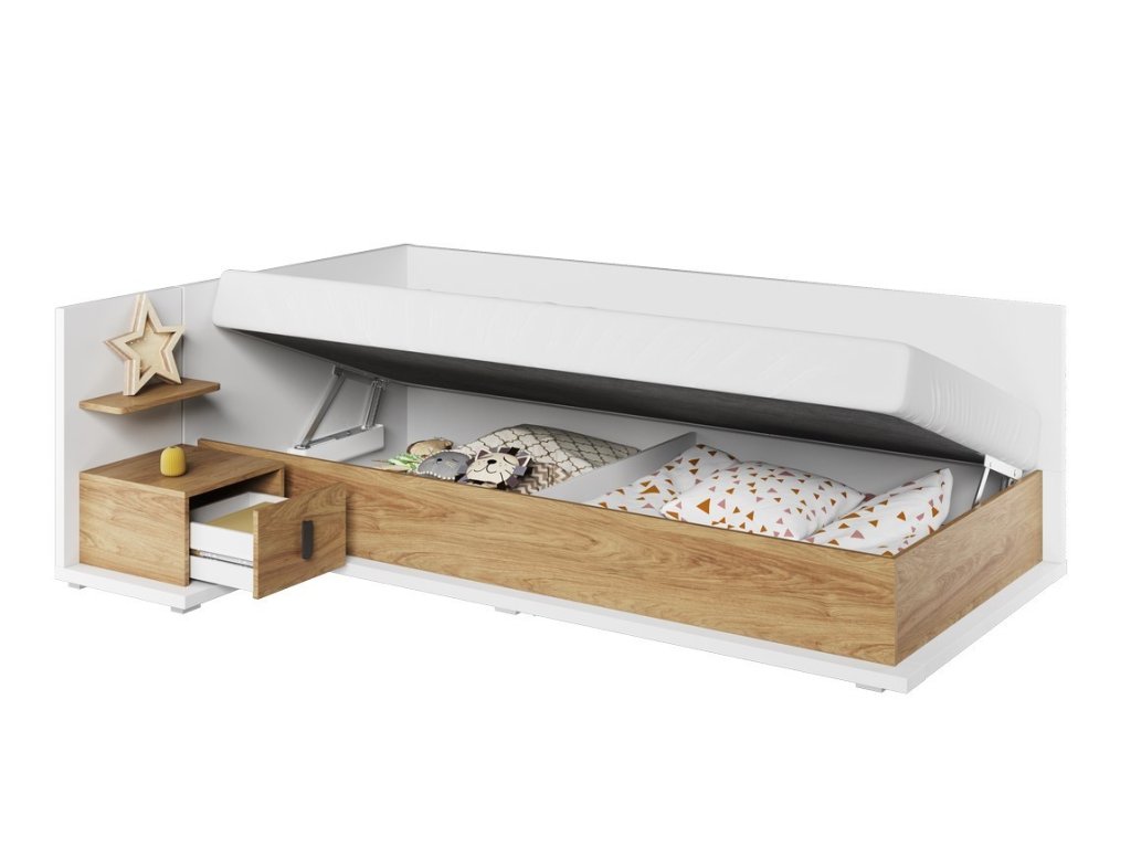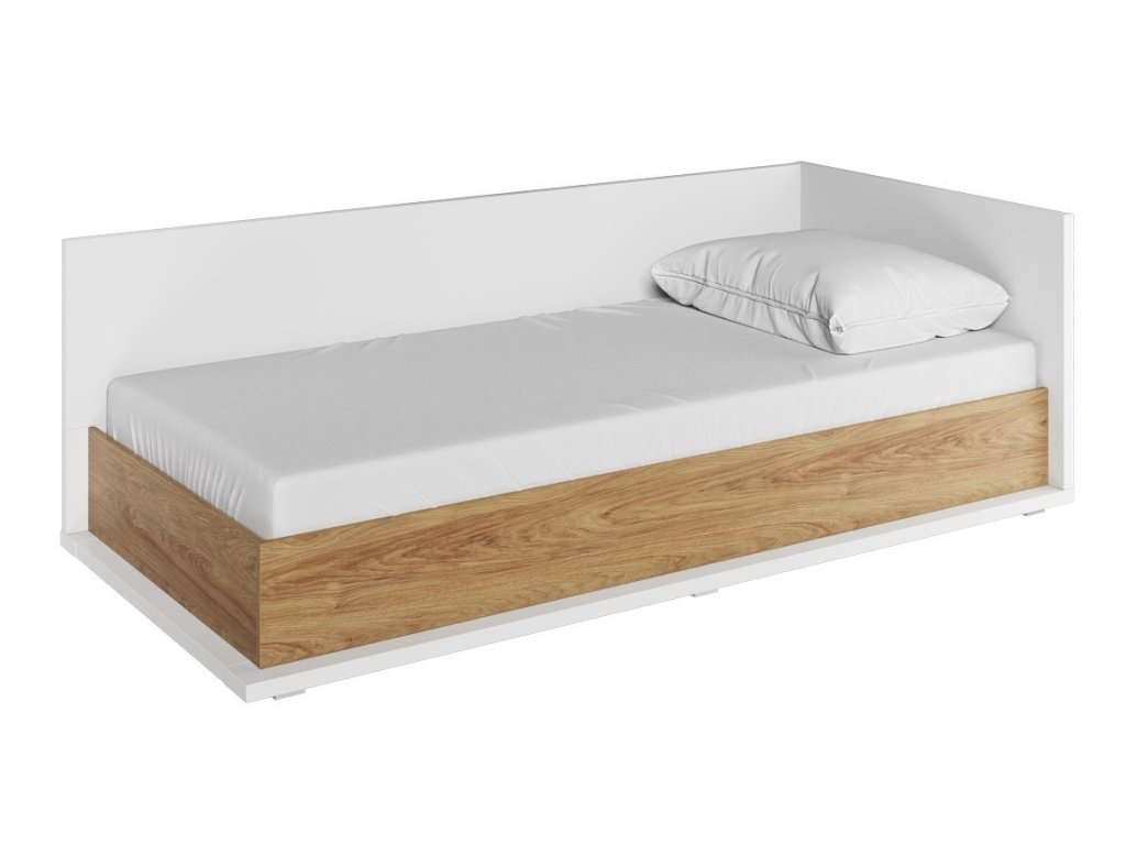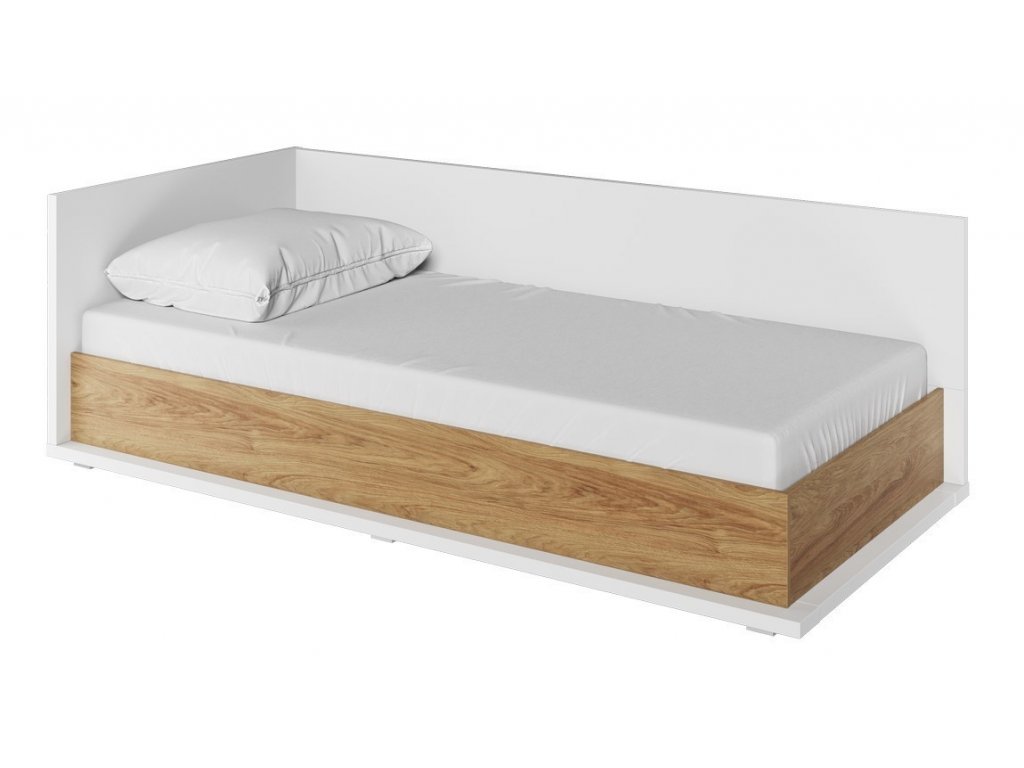 Postel s úložným prostorem a opěrným panelem v jemném přírodním stylu. Korpus je vyroben z desky LTD v barvě bílá, boční desky postele jsou vyrobeny z desky LTD v barvě ořech natural. Bonelová matrace je součástí postele. Provedení na levou stranu v kombinaci s nočním stolkem MN-08L. Dodáváme v demontovaném stavu.Doplňkové parametry