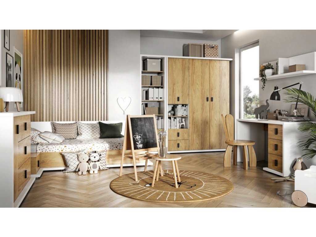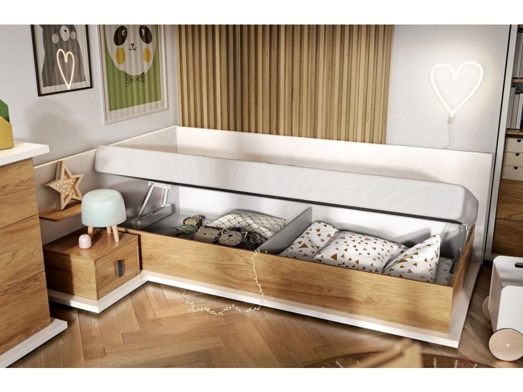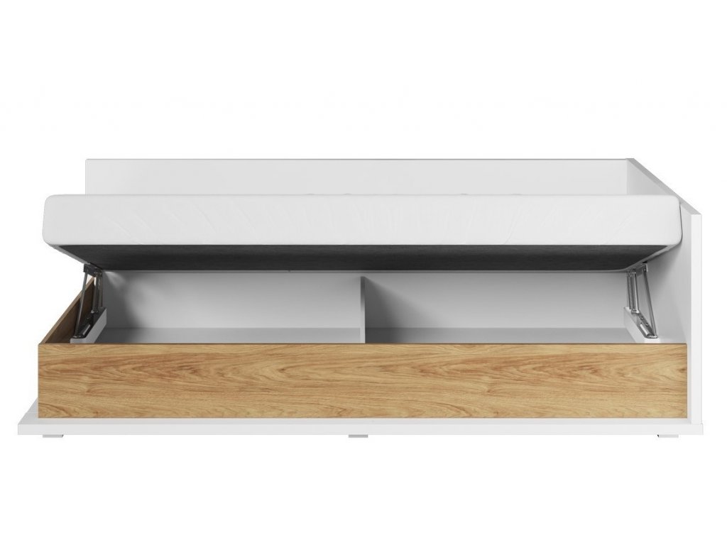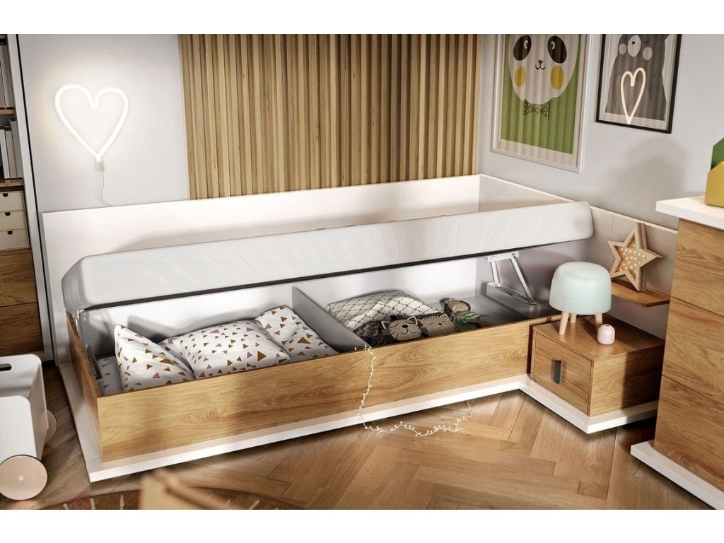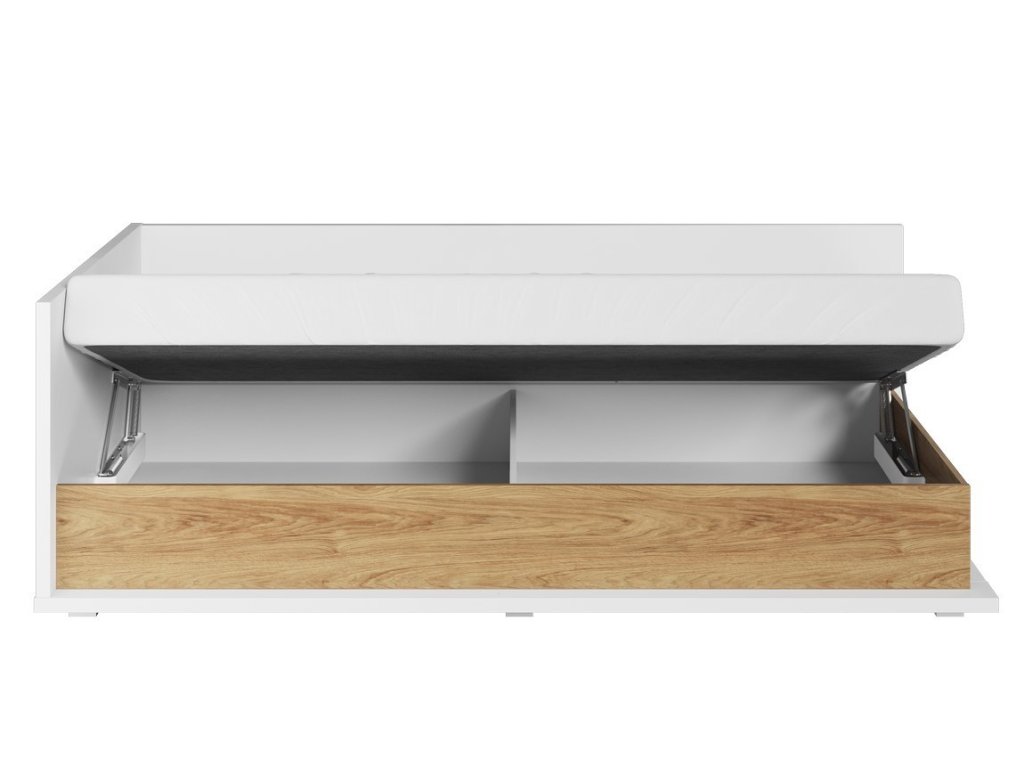 Postel s úložným prostorem a opěrným panelem v jemném přírodním stylu. Korpus je vyroben z desky LTD v barvě bílá, boční desky postele jsou vyrobeny z desky LTD v barvě ořech natural. Bonelová matrace je součástí postele. Provedení na levou stranu v kombinaci s nočním stolkem MN-08L. Dodáváme v demontovaném stavu.Doplňkové parametry