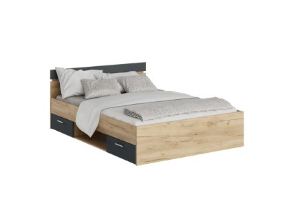 Moderní dvoulůžko z ložnicové řady s praktickými zásuvkami dokonale doplní váš interiér. Postel s dvěma integrovanými nočními stolky je vyrobena z kvalitní LTD desky v barvě dub...