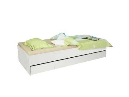 Jednolůžko z masivu v bílém laku s úložnými zásuvkami a roštem. Pro matraci 90 × 200 cm. Matrace není součástí.