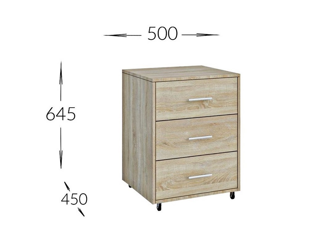 Pojízdný kontejner k pracovnímu stolu. Kontejner má 3 zásuvky. Korpus i dvířka jsou z kvalitní LTD v barvě dub sonoma.