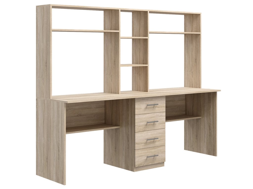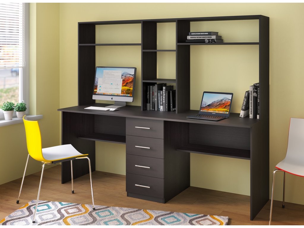 Praktický pracovní stůl se dvěma pracovními plochami a policovým nástavcem je vyroben z LTD desky odolné vůči poškrábání v barvě wenge. Stůl je uprostřed rozdělen čtyřmi zásuvkami. Výška stolu včetně nástavce je 152 cm, hloubka nástavce je 30 cm. Výška pracovní plochy je 76,5 cm. Dodáváme v demontovaném stavu.Doplňkové parametry