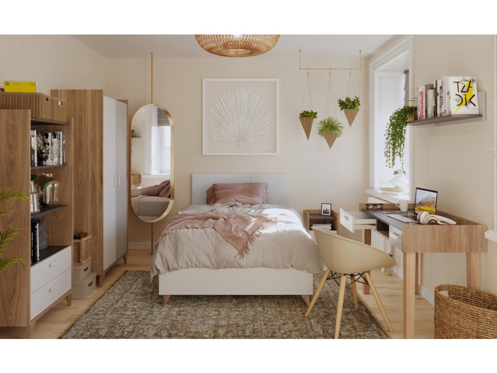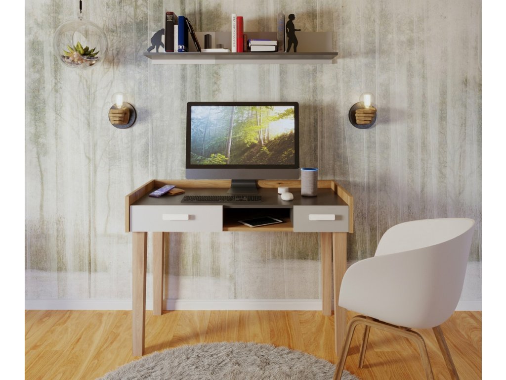Pracovní stůl se dvěma zásuvkami v moderním stylu a geometrických tvarech. Nábytek je vyroben z desky LTD hraněné páskou ABS, korpus je v barvě dub castello medový, zásuvky jsou v barvě bílá alpská a šedá. Snížená pracovní deska zabraňuje padání věcí ze stolu. Nožky mají netradiční zkosený tvar. Dodáváme v demontovaném stavu.Doplňkové parametry