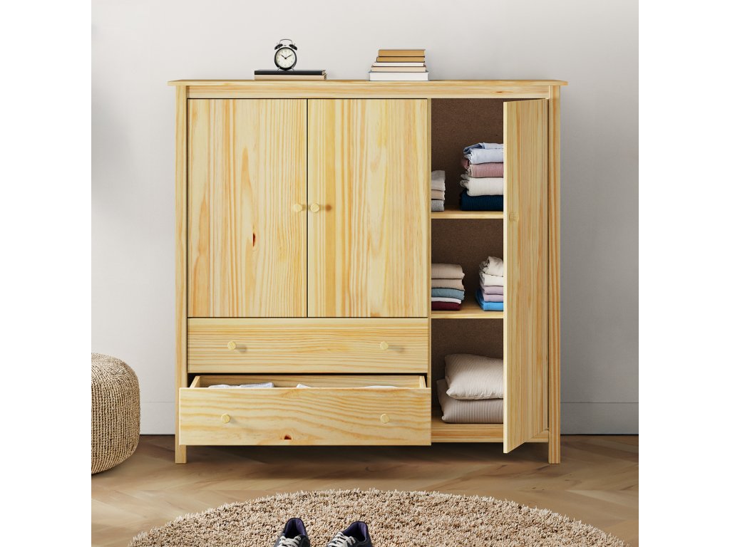 Materiál masiv borovice, lakované provedení3 dvířka a 2 zásuvky s kovovými pojezdy