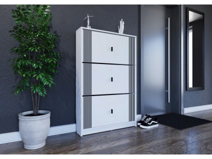 Třídveřový výklopný botník v moderním provedení. Korpus i dvířka jsou z kvalitního LTD v barvě matná bílá s v kombinaci s dekoračními šedými proužky.Rozměry : 80x x120 x17cm.