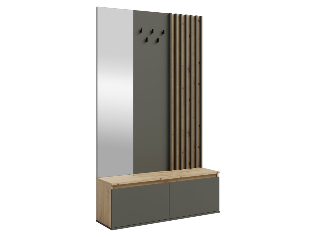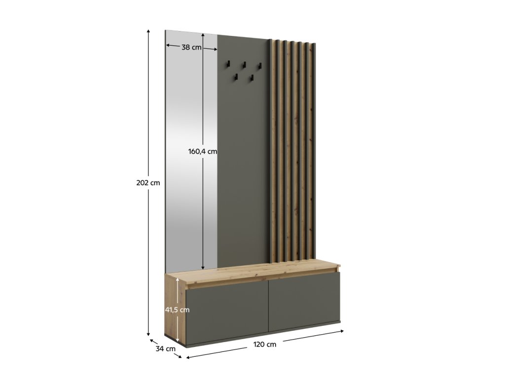 Moderní předsíňová stěna (DERIS) v kombinaci grafitu a dekoru dub artisan spojuje styl i funkčnost.- Rozměry: 120×34×202 cm
