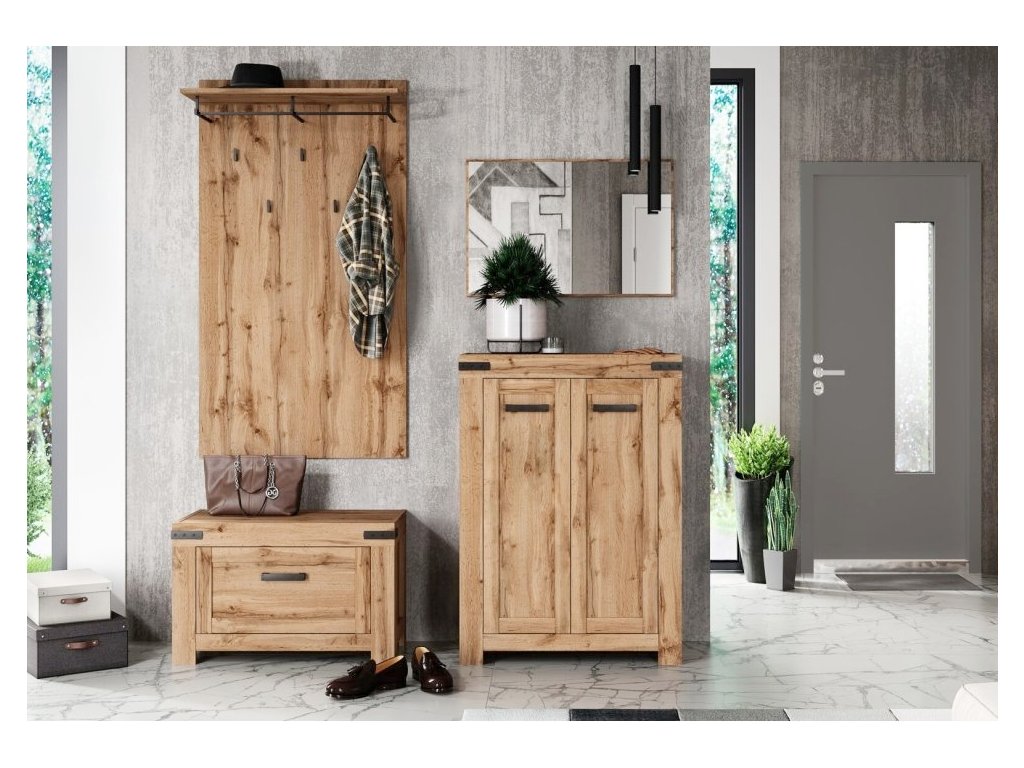 Stylová předsíňová sestava RIMOTTO v dekoru dub Wotan vytvoří útulný a praktický vstupní prostor. Nabízí dostatek úložného místa pro boty, oblečení i doplňky a zároveň působí moderním dojmem.