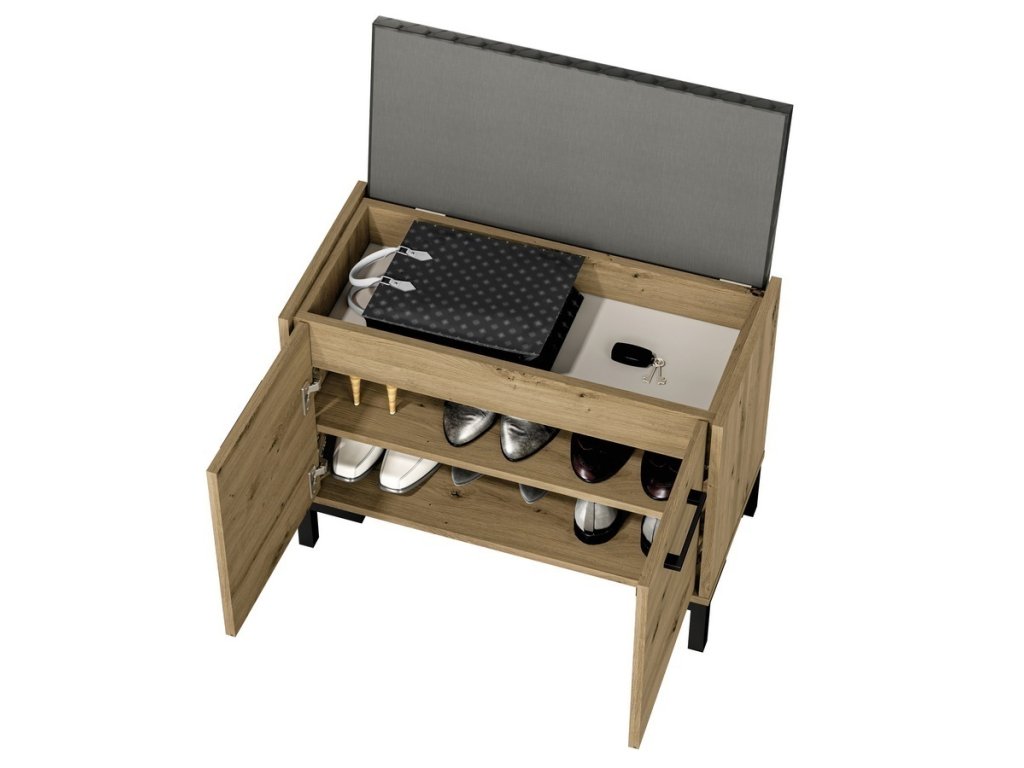 Předsíňová sestava je vyrobena z desky LTD v barvě dub artisan. Sestava se skládá z těchto položek (Š x V x H cm) - botník (70 x 54 x 34 cm), věšáková stěna v barvě černá (70 x 145 x 3 cm) a šatní skříň (55 x 200 x 34 cm). Čalouněný sedák je součástí sestavy. Úchyty jsou plastové. Možnost dokoupení dalších segmentů. Dodáváme v demontovaném stavu.Doplňkové parametry
