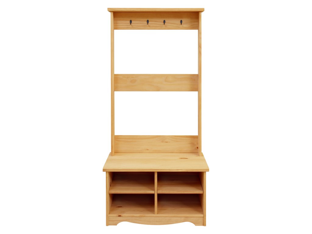 Předsíňová stěna, materiál masiv borovice voskovaná, v medovém odstínu, 4 kovové háčky, 4 otevřené police na boty, výška sedu lavice 45 cm, součást sestavy Corona 2.Doplňkové parametry