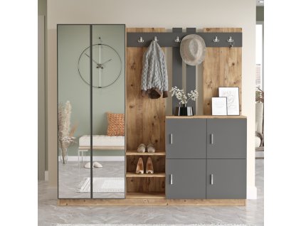 Praktická předsíňová sestava v industriálním stylu bude ozdobou Vaší předsíně.Korpus je v barvě šedé, přední část dveří je doplněna lištami z přírodního dubového dřeva. Sestava...