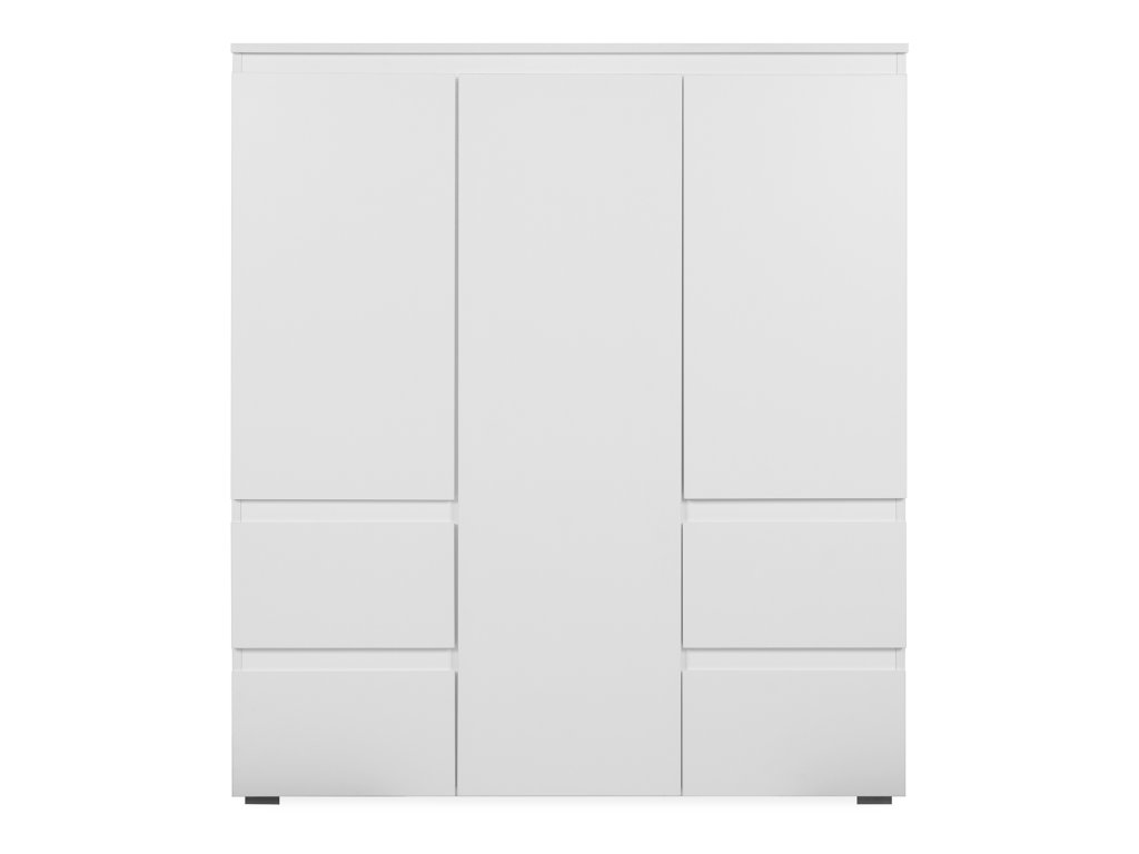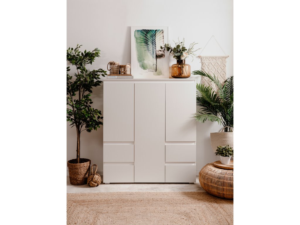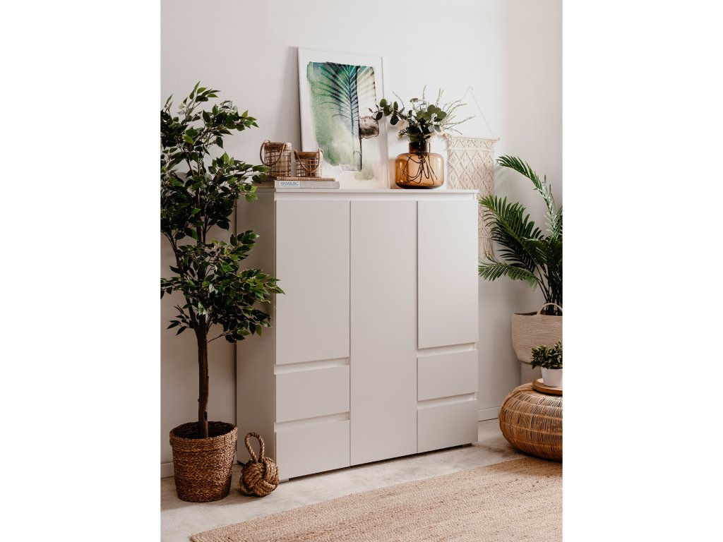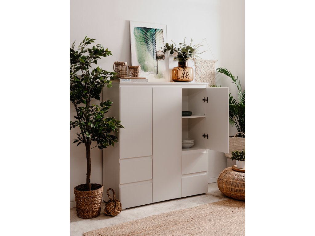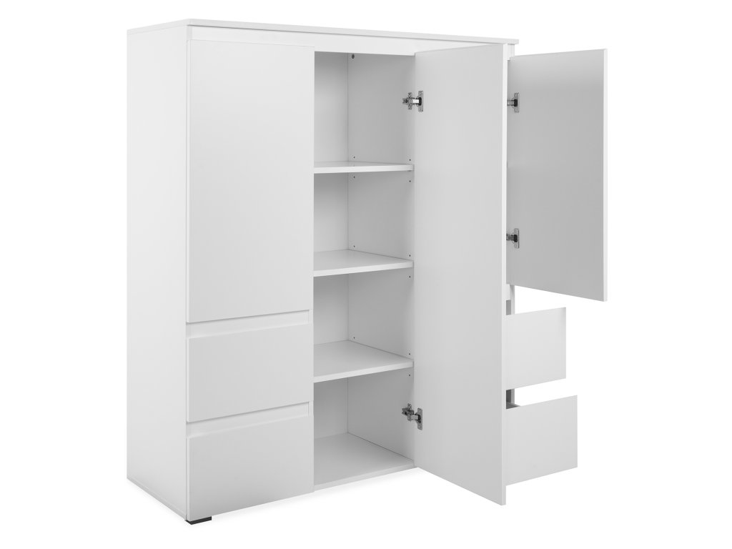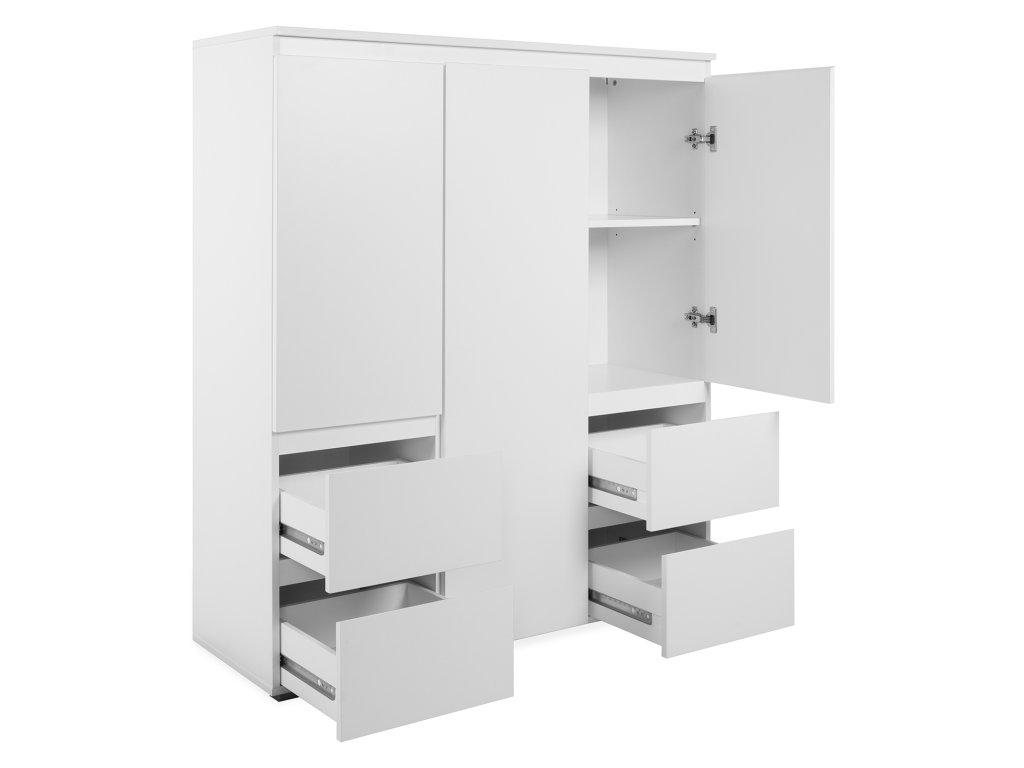 Příborník, barevné provedení bílá, 3 dveře, 5 variabilních polic, 4 zásuvky s kovovými pojezdy.Doplňkové parametry