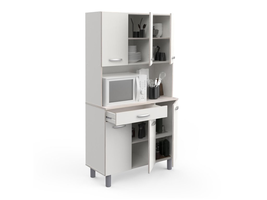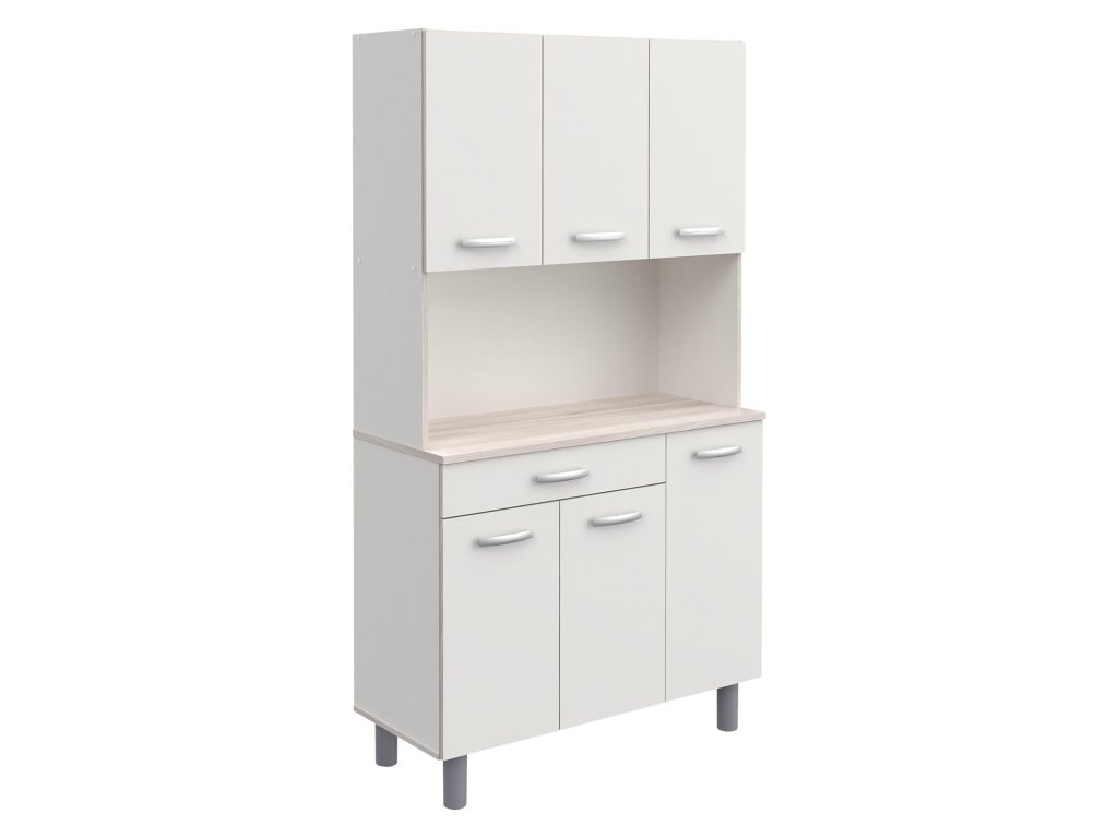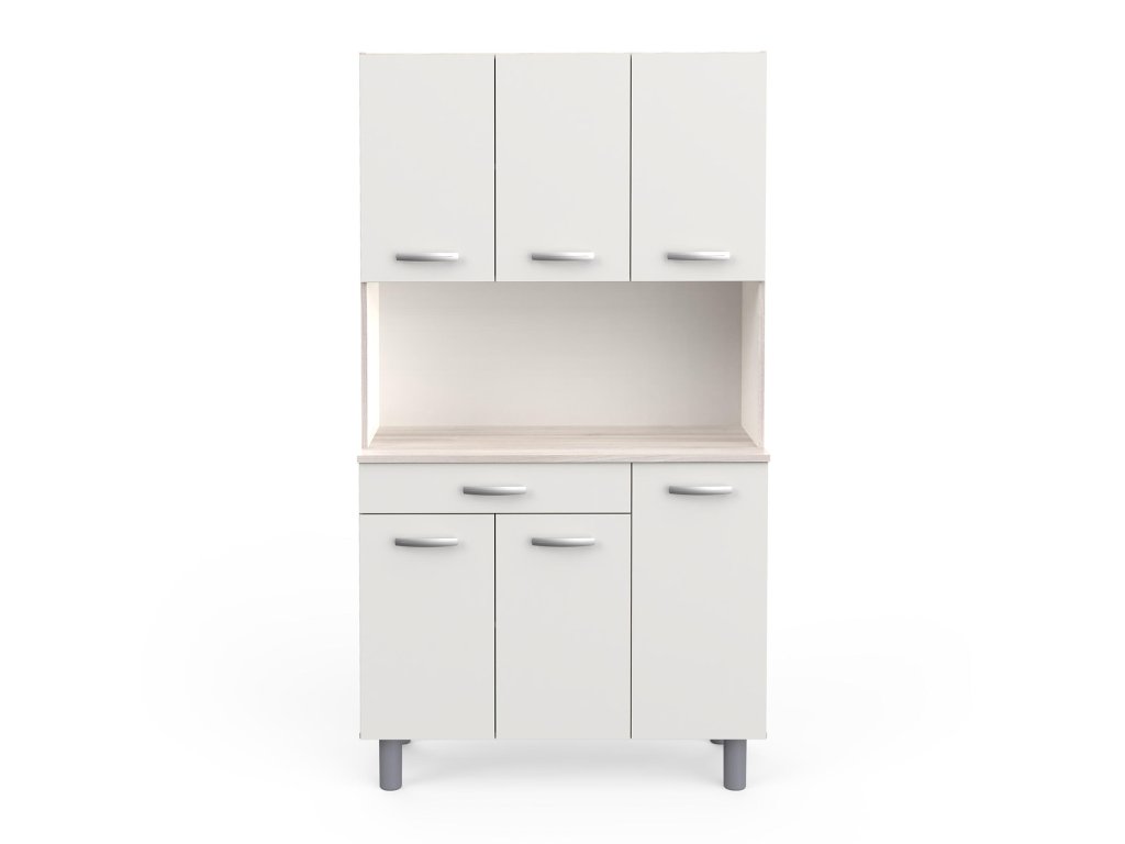 Příborník, barevné provedení akácie / bílá, v horní části 3 dvířka, v dolní části 3 dvířka, 1 zásuvka s kovovými pojezdy, ve střední části prostor nejen pro mikrovlnnou troubu v rozměru (š/h/v) 97 × 33 × 42 cm.Doplňkové parametry