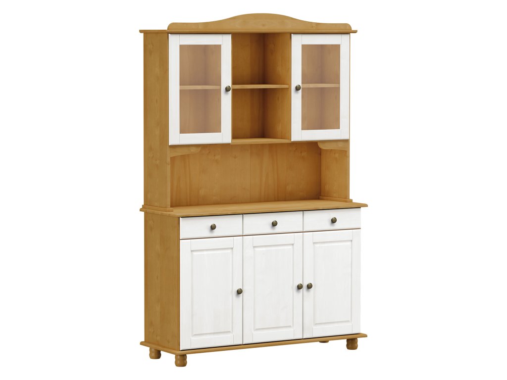 materiál masiv borovice, barevné provedení dub / bílý lak, v dolní části 3 dveře, 3 zásuvky s kovovými pojezdy v horní části dvoje prosklené dveřeDoplňkové parametry